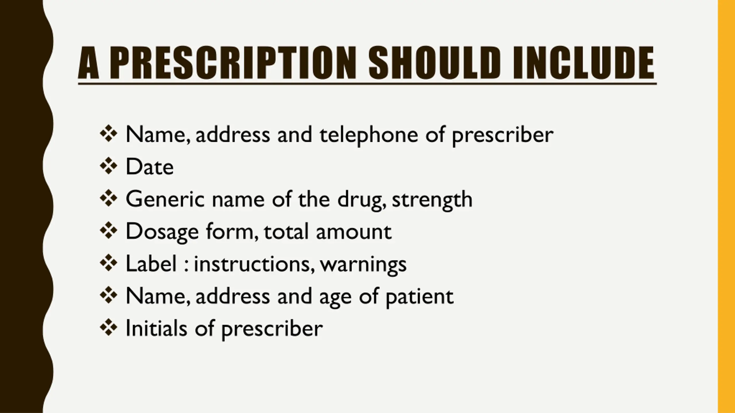 A PRESCRIPTION SHOULD INCLUDE Name, address and telephone of prescriber Date Generic name of the drug, strength Dosage form, total amount Label : instructions, warnings Name, address and age of patient Initials of prescriber