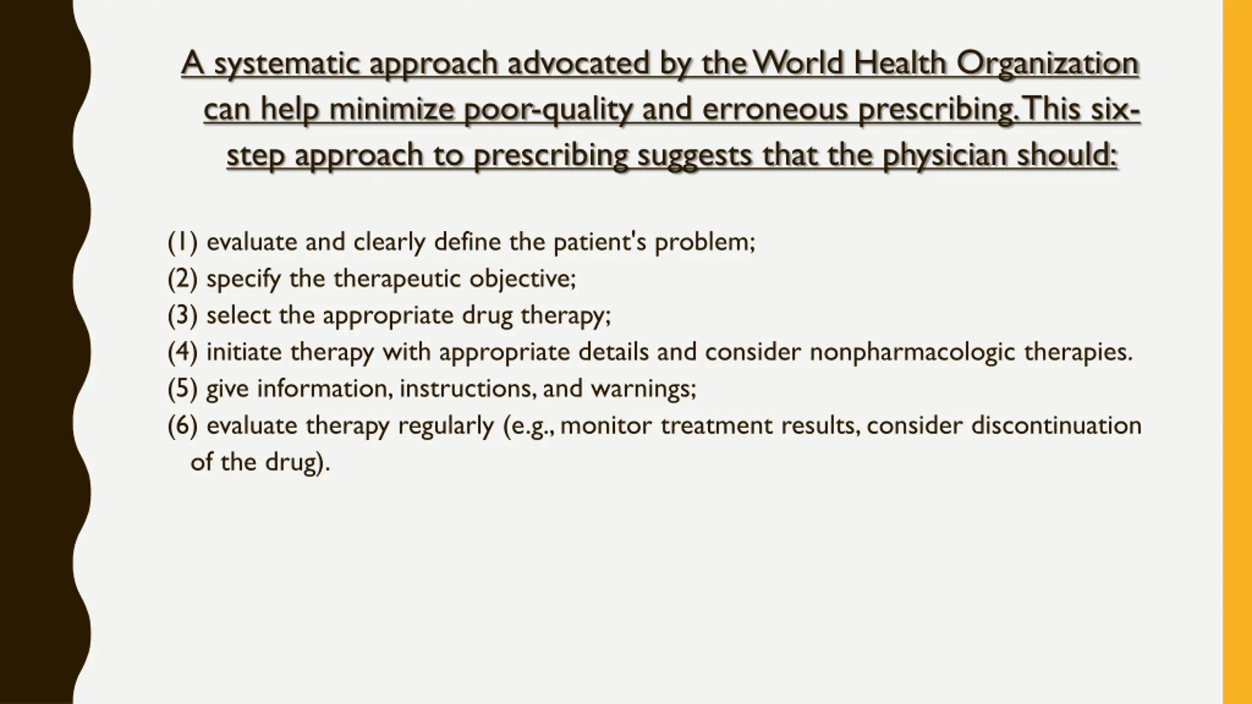 A systematic approach advocated by the World Health Organization can help minimize poor-quality and erroneous prescribing. This six- step approach to prescribing suggests that the physician should: (1) evaluate and clearly define the patient's problem; (2) specify the therapeutic objective; (3) select the appropriate drug therapy; (4) initiate therapy with appropriate details and consider nonpharmacologic therapies. (5) give information, instructions, and warnings; (6) evaluate therapy regularly (e.g., monitor treatment results, consider discontinuation of the drug).