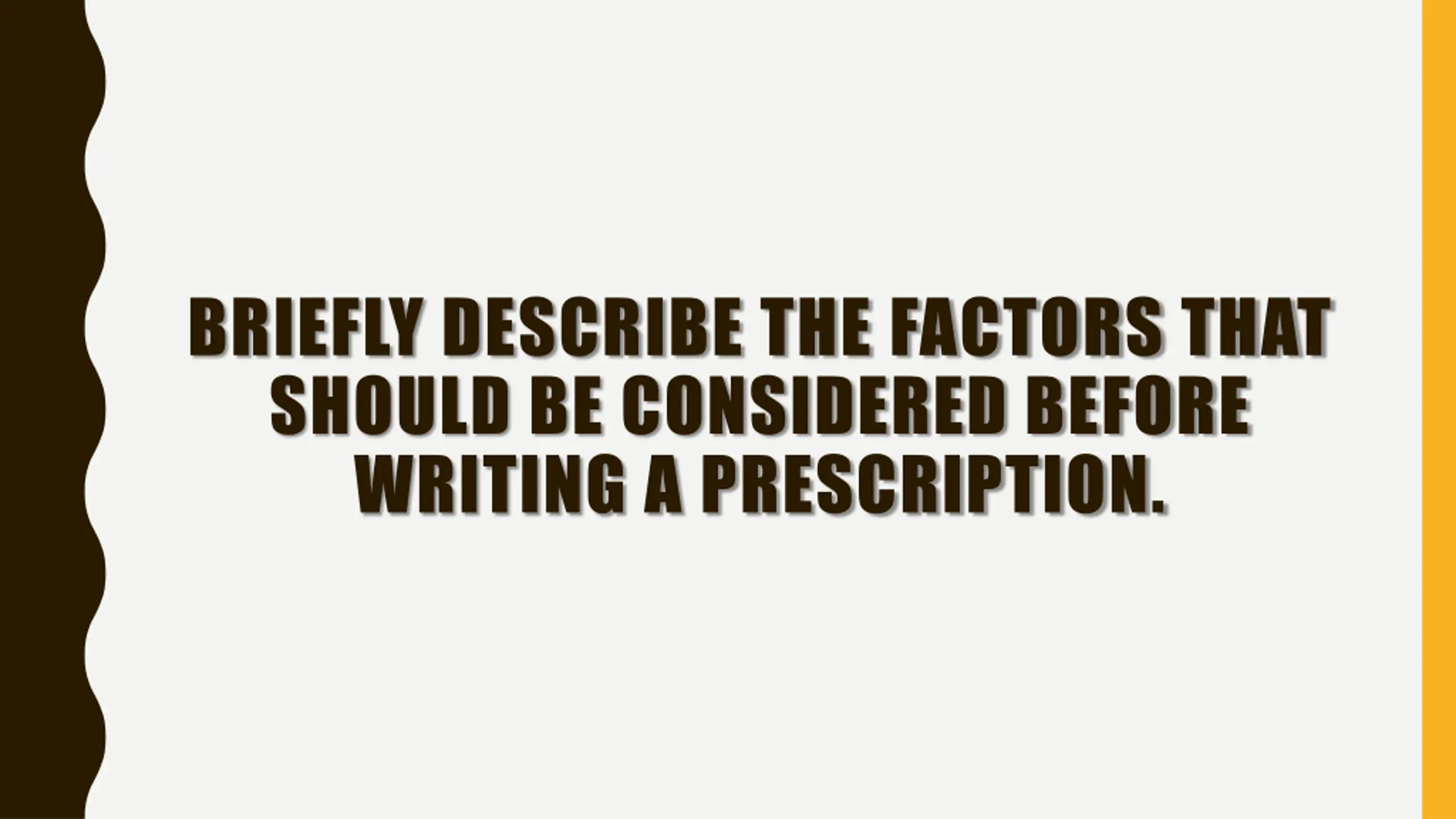 BRIEFLY DESCRIBE THE FACTORS THAT SHOULD BE CONSIDERED BEFORE WRITING A PRESCRIPTION.