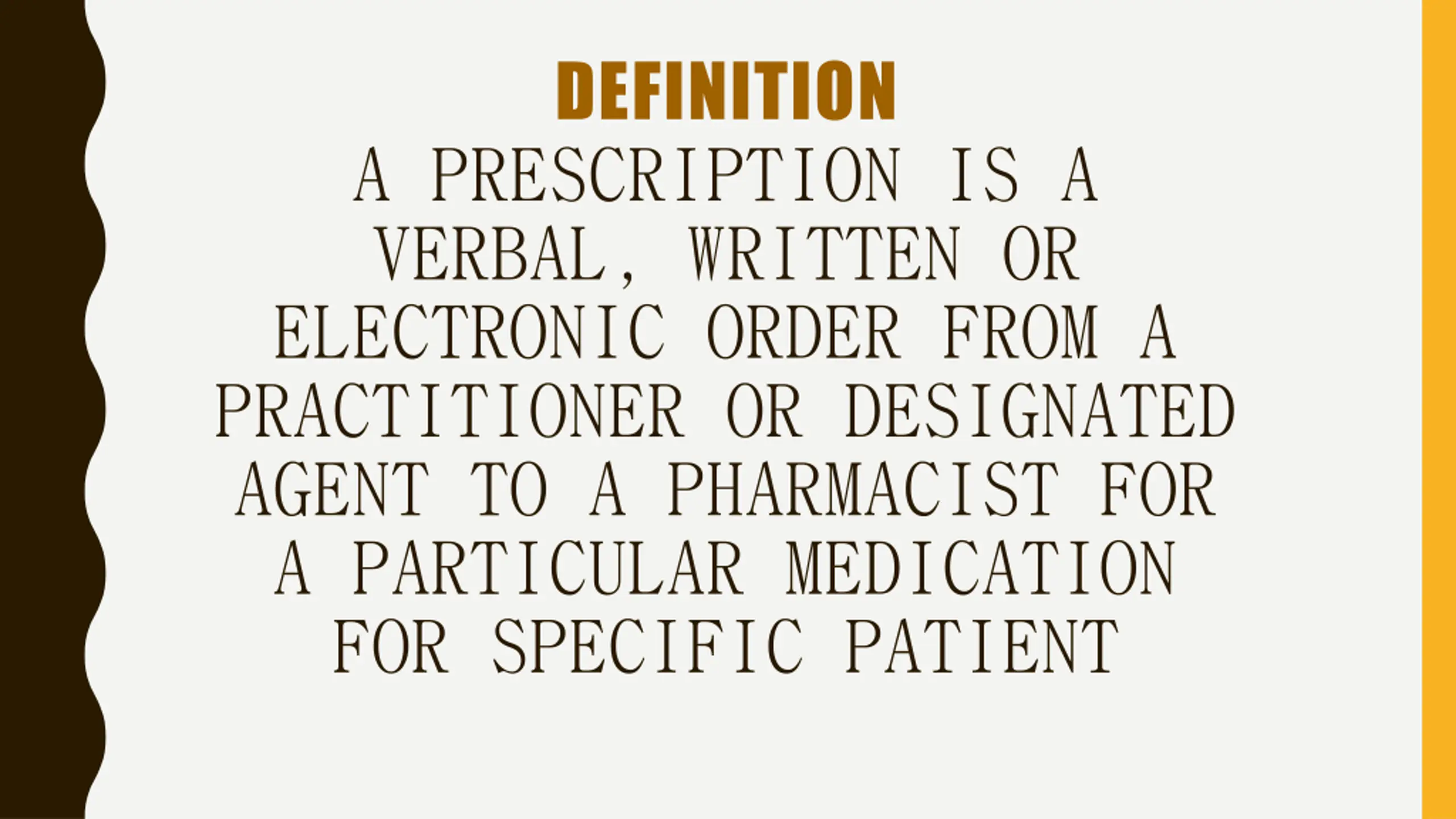 DEFINITION A PRESCRIPTION IS A VERBAL, WRITTEN OR ELECTRONIC ORDER FROM A PRACTITIONER OR DESIGNATED AGENT TO A PHARMACIST FOR A PARTICULAR MEDICATION FOR SPECIFIC PATIENT