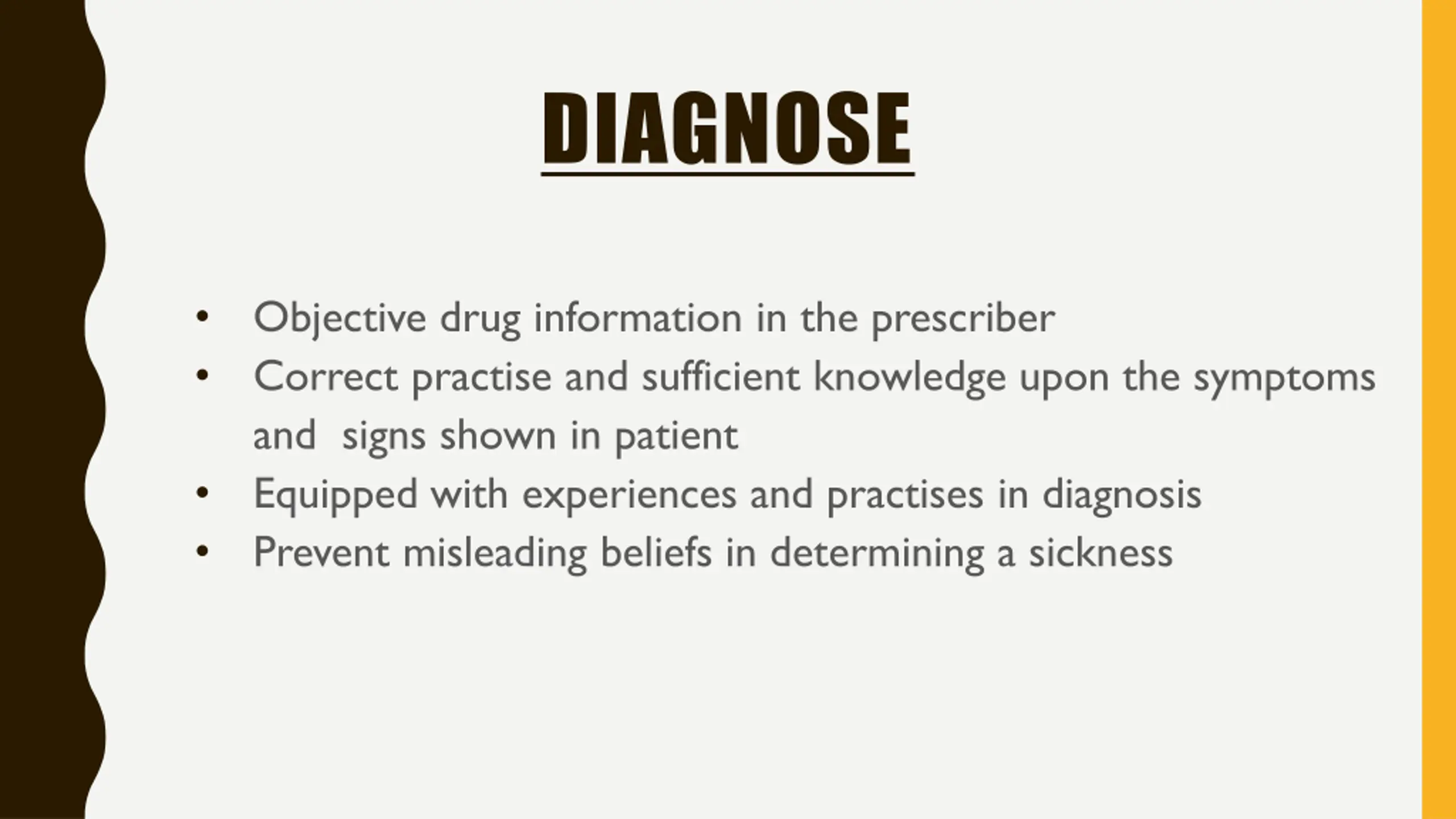 DIAGNOSE Objective drug information in the prescriber Correct practise and sufficient knowledge upon the symptoms and signs shown in patient Equipped with experiences and practises in diagnosis Prevent misleading beliefs in determining a sickness