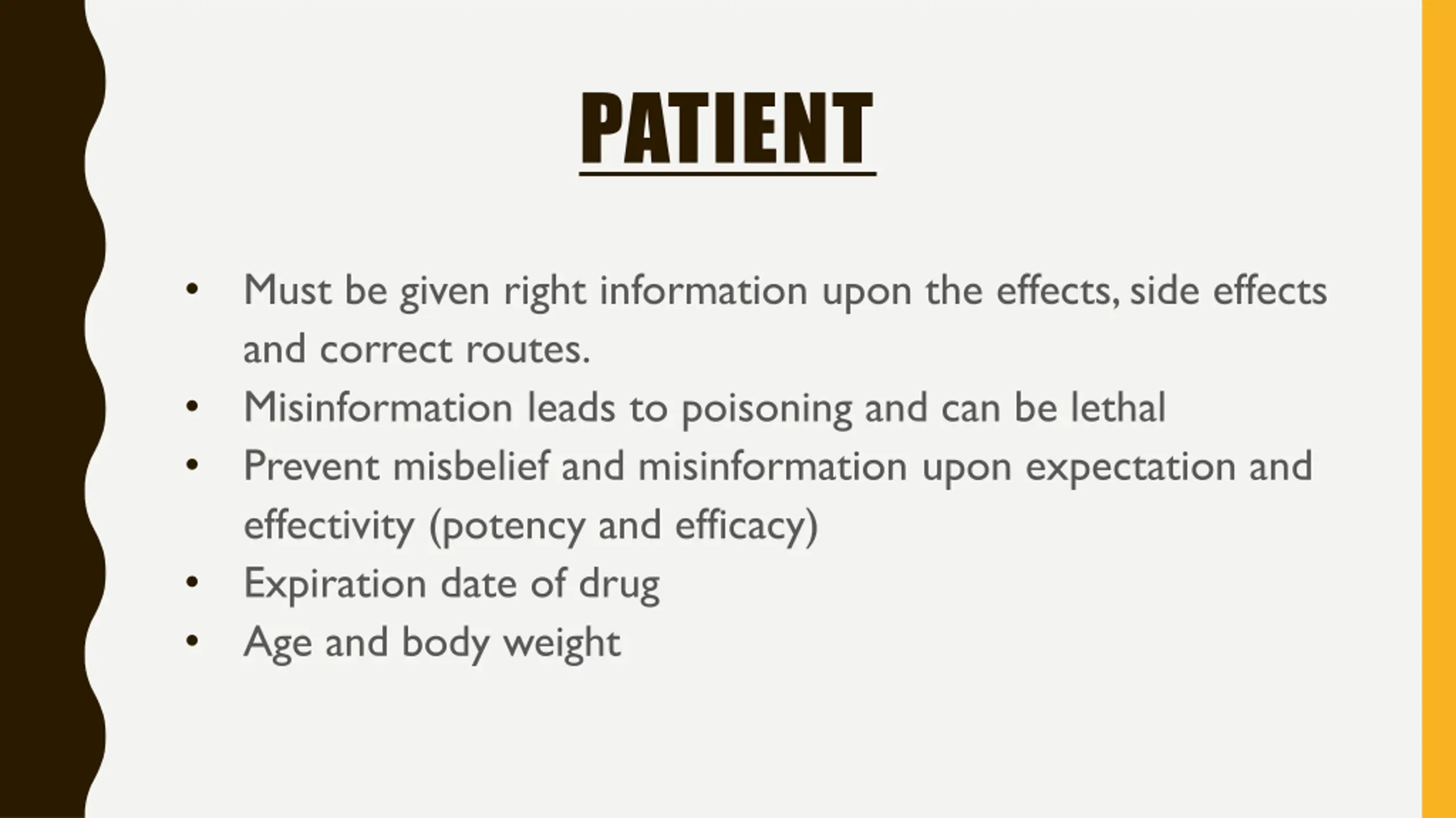 PATIENT Must be given right information upon the effects, side effects and correct routes. Misinformation leads to poisoning and can be lethal Prevent misbelief and misinformation upon expectation and effectivity (potency and efficacy) Expiration date of drug Age and body weight