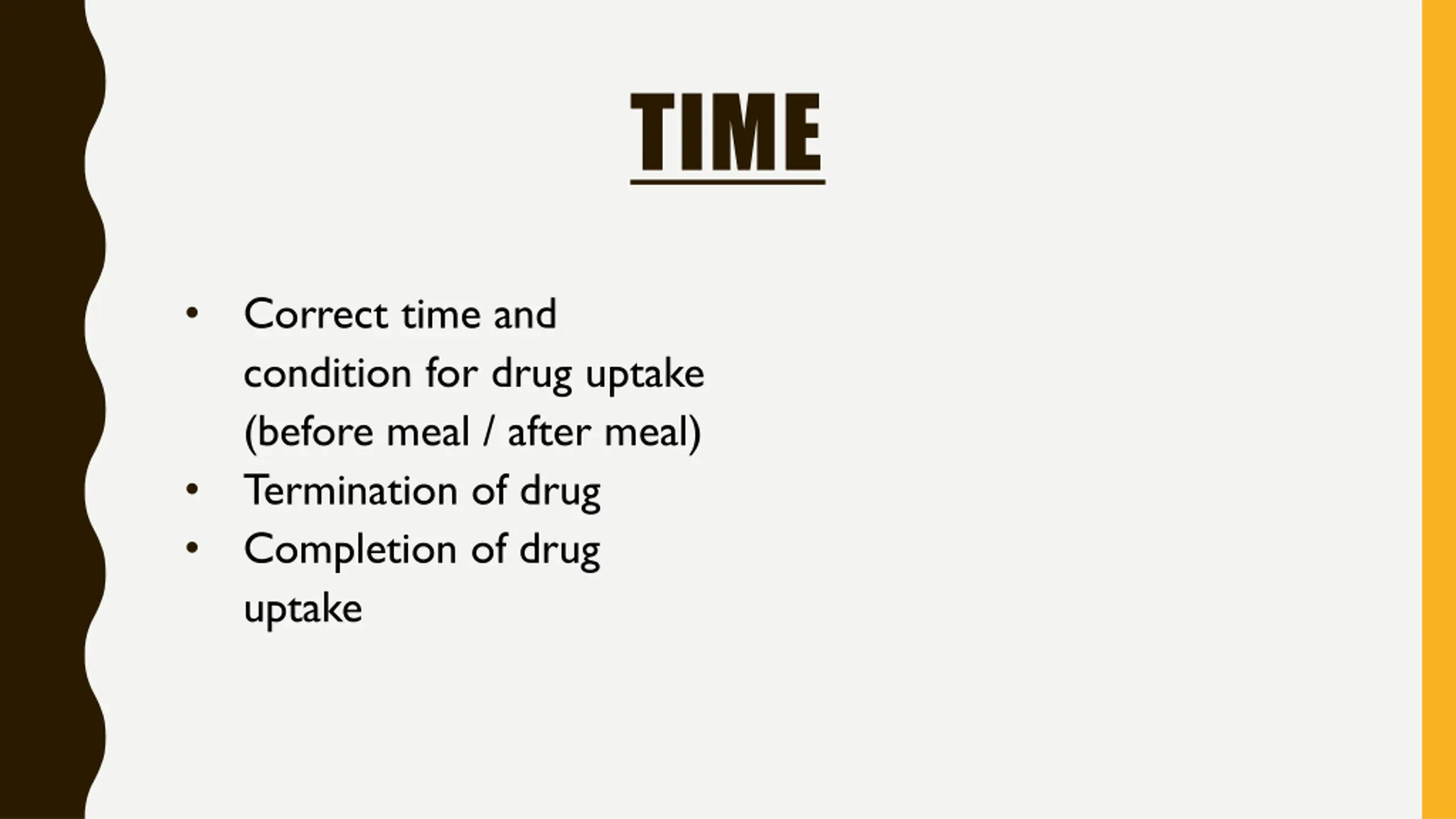 TIME Correct time and condition for drug uptake (before meal / after meal) Termination of drug Completion of drug uptake