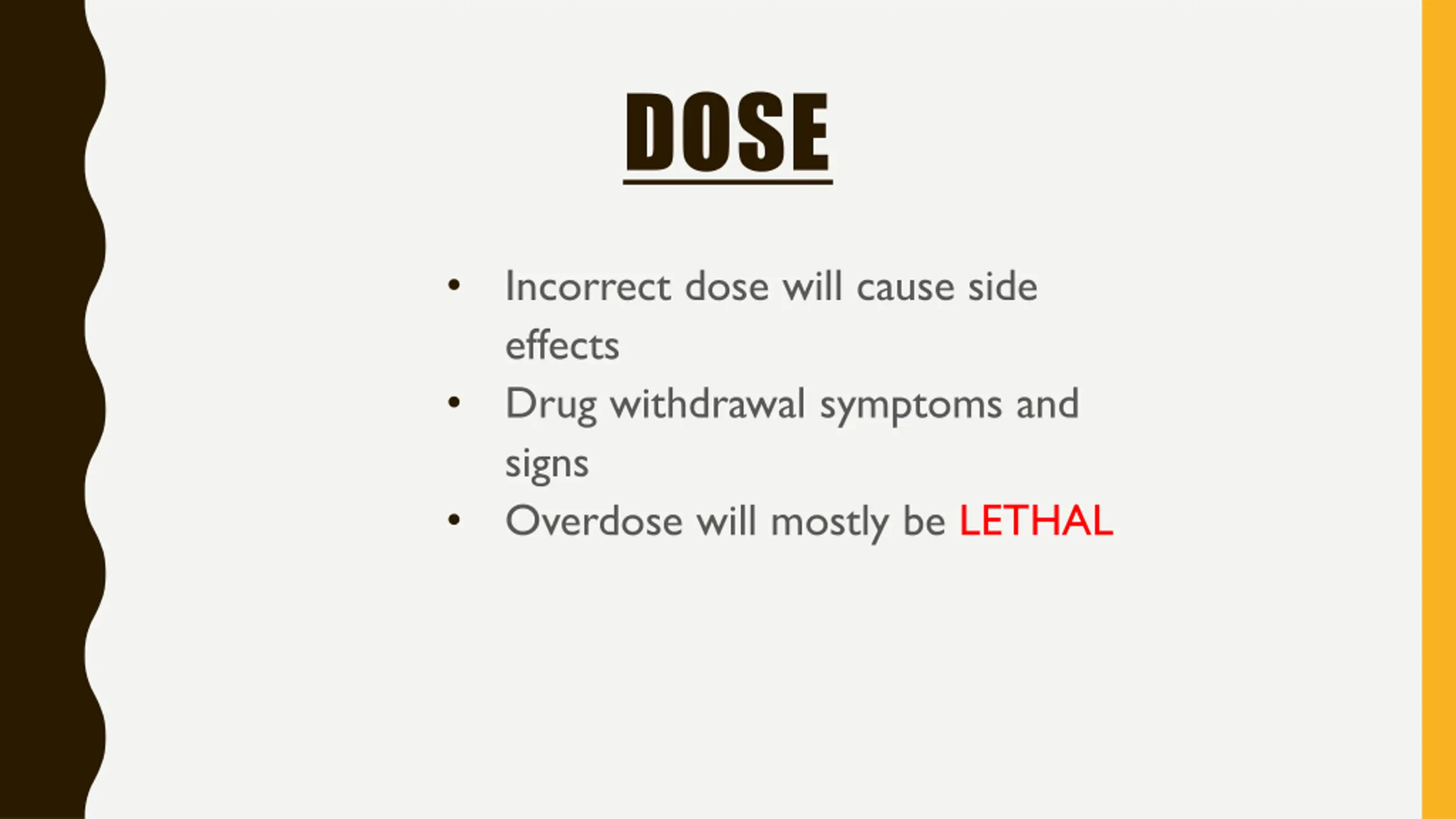 DOSE Incorrect dose will cause side effects Drug withdrawal symptoms and signs Overdose will mostly be LETHAL