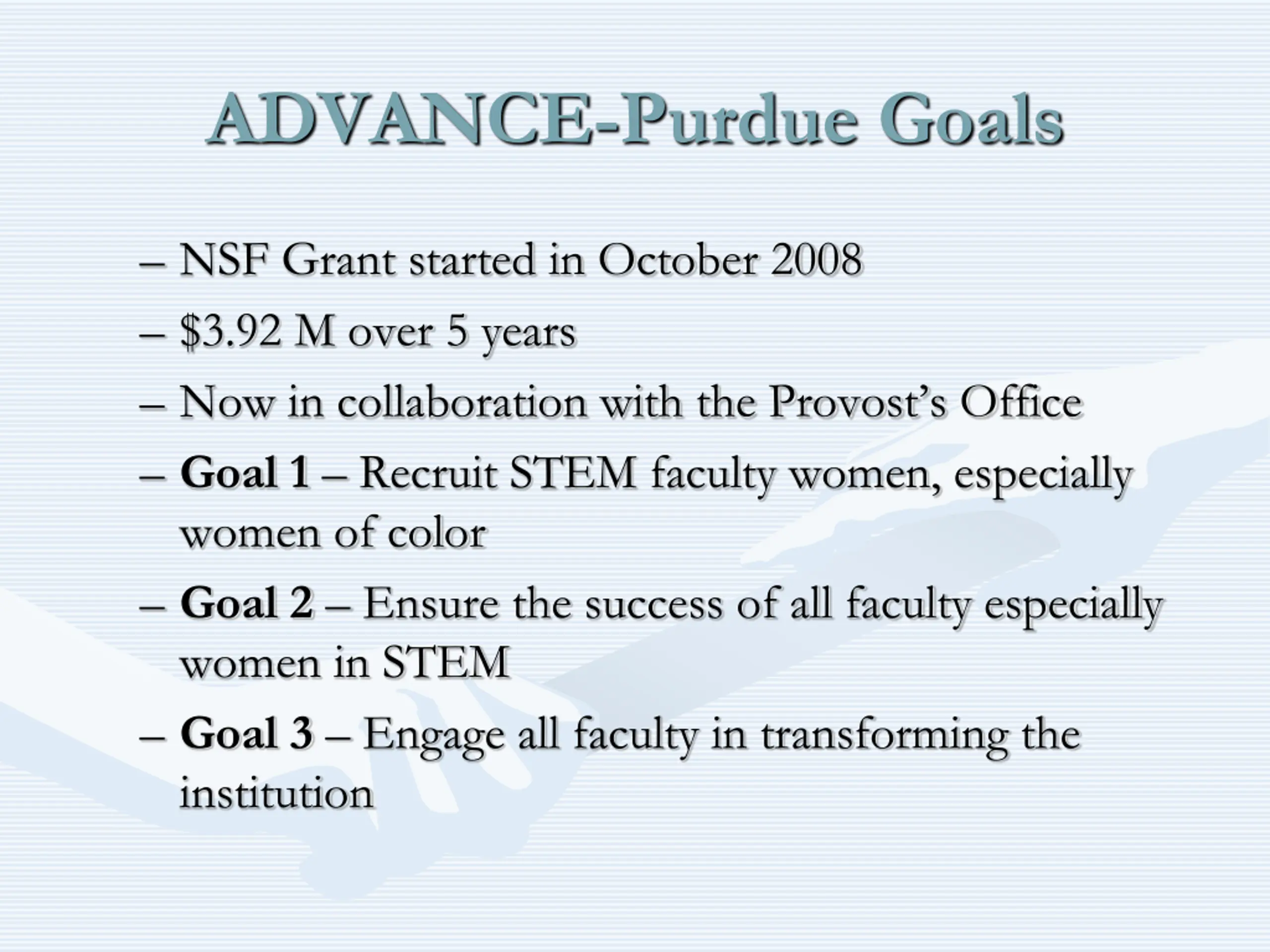 ADVANCE-Purdue Goals NSF Grant started in October 2008 $3.92 M over 5 years Now in collaboration with the Provost s Office Goal 1 Recruit STEM faculty women, especially women of color Goal 2 Ensure the success of all faculty especially women in STEM Goal 3 Engage all faculty in transforming the institution