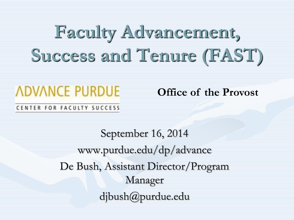 Faculty Advancement, Success and Tenure (FAST) Office of the Provost September 16, 2014 www.purdue.edu/dp/advance De Bush, Assistant Director/Program Manager djbush@purdue.edu