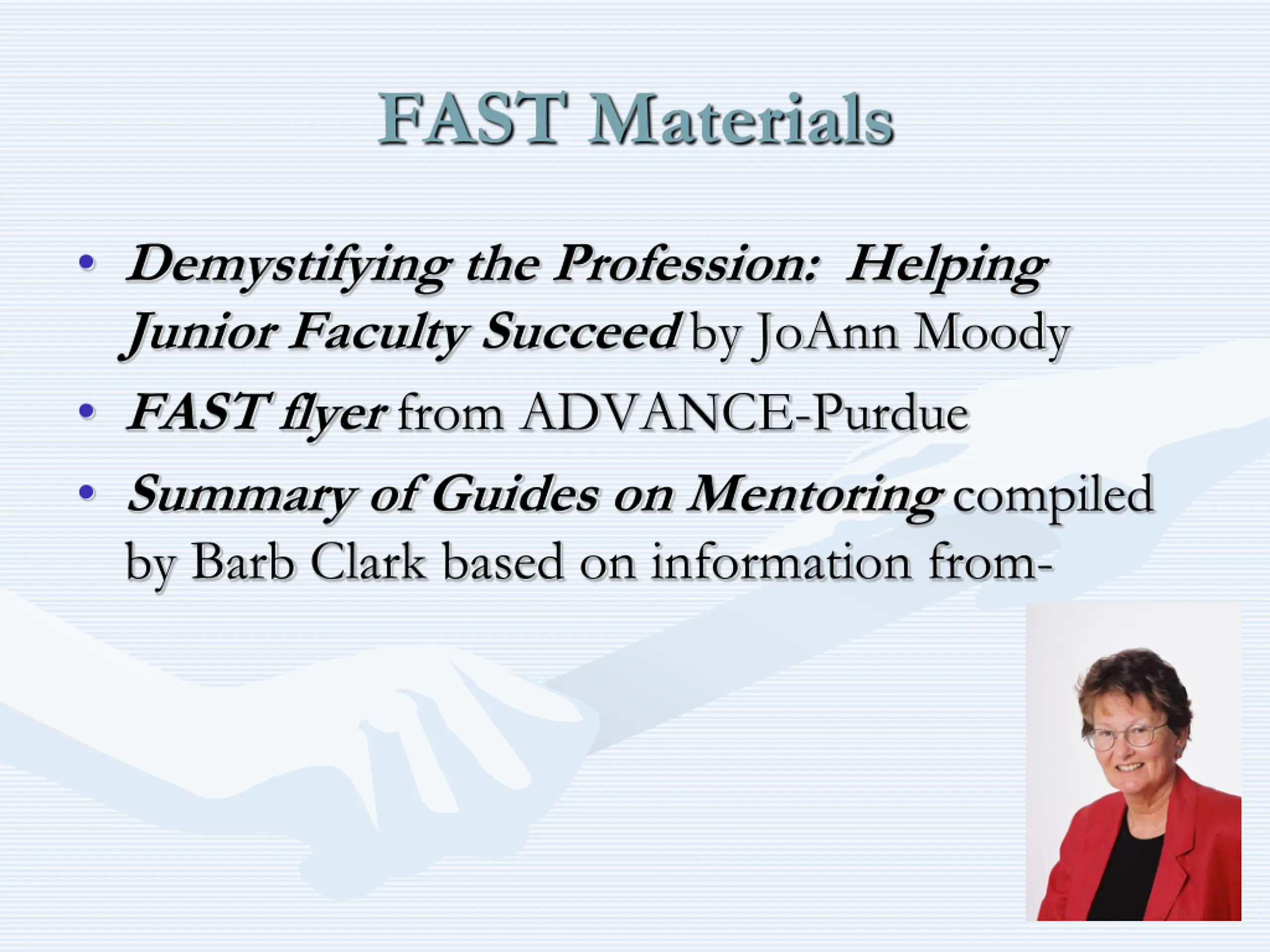 FAST Materials Demystifying the Profession: Helping Junior Faculty Succeed by JoAnn Moody FAST flyer from ADVANCE-Purdue Summary of Guides on Mentoring compiled by Barb Clark based on information from-