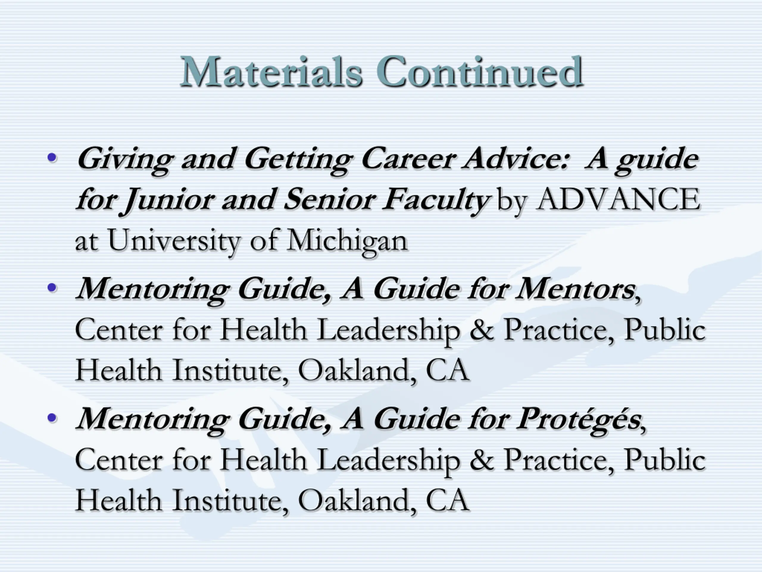 Materials Continued Giving and Getting Career Advice: A guide for Junior and Senior Faculty by ADVANCE at University of Michigan Mentoring Guide, A Guide for Mentors, Center for Health Leadership & Practice, Public Health Institute, Oakland, CA Mentoring Guide, A Guide for Prot g s, Center for Health Leadership & Practice, Public Health Institute, Oakland, CA