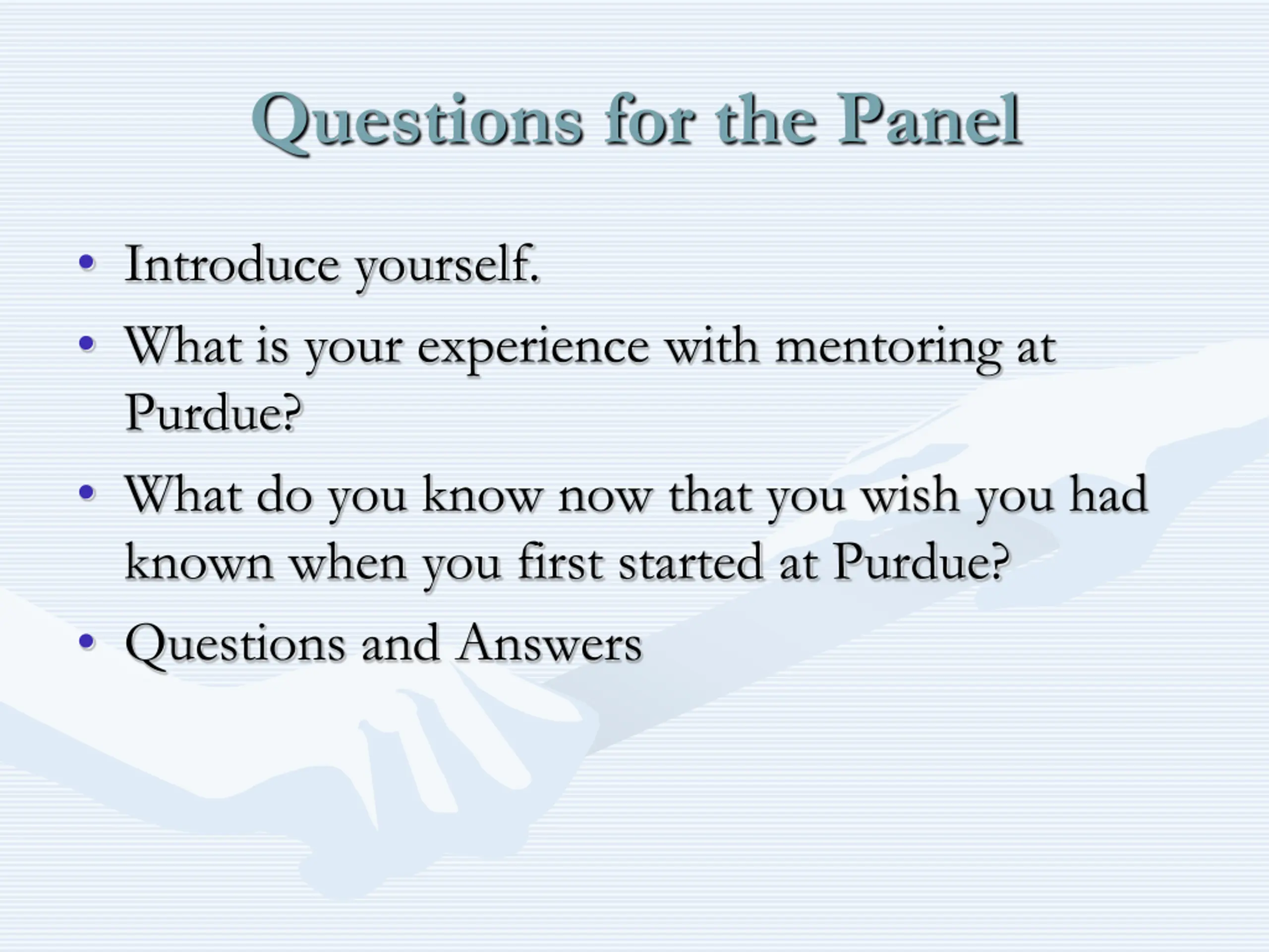 Questions for the Panel Introduce yourself. What is your experience with mentoring at Purdue? What do you know now that you wish you had known when you first started at Purdue? Questions and Answers