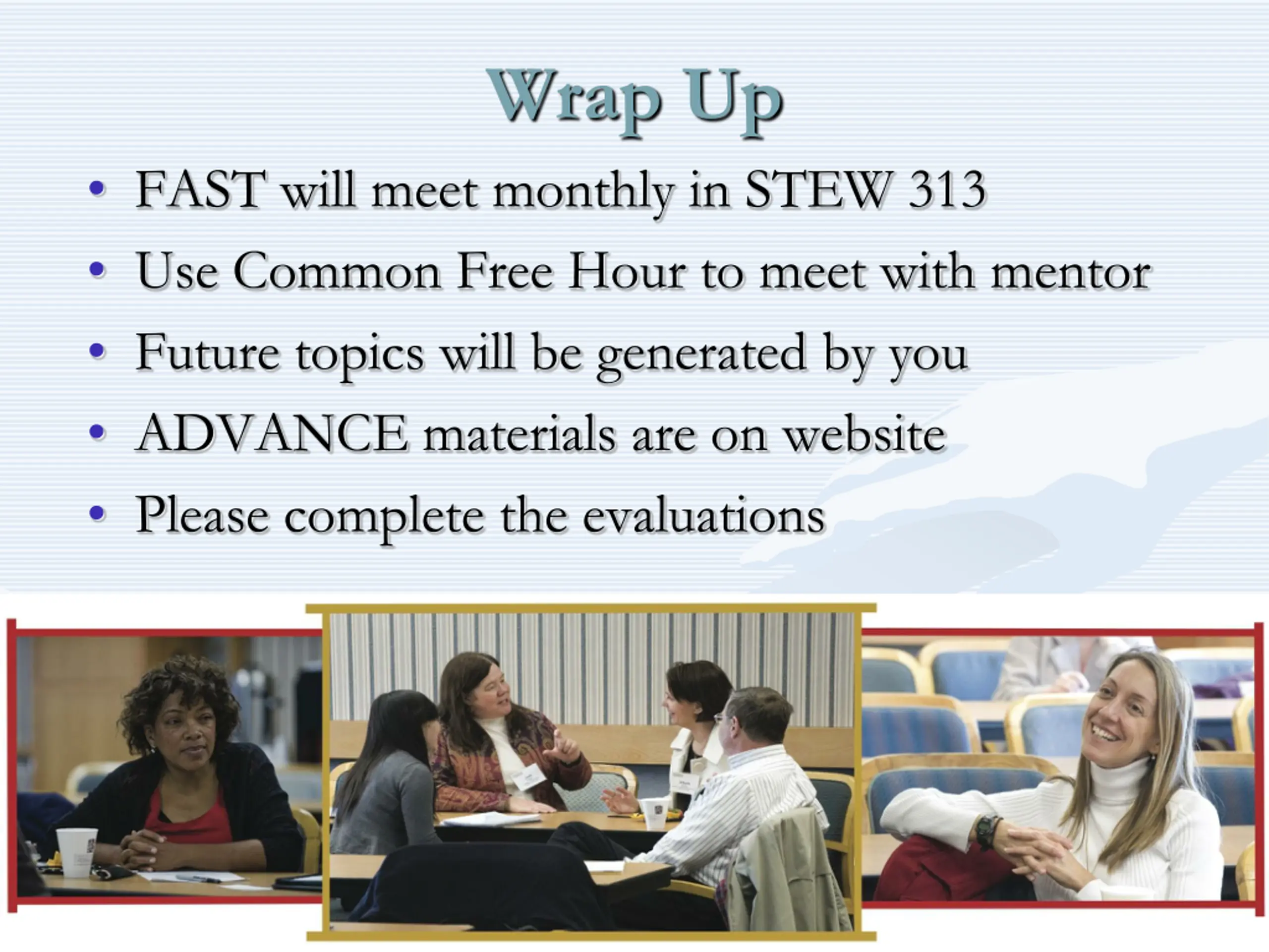Wrap Up FAST will meet monthly in STEW 313 Use Common Free Hour to meet with mentor Future topics will be generated by you ADVANCE materials are on website Please complete the evaluations