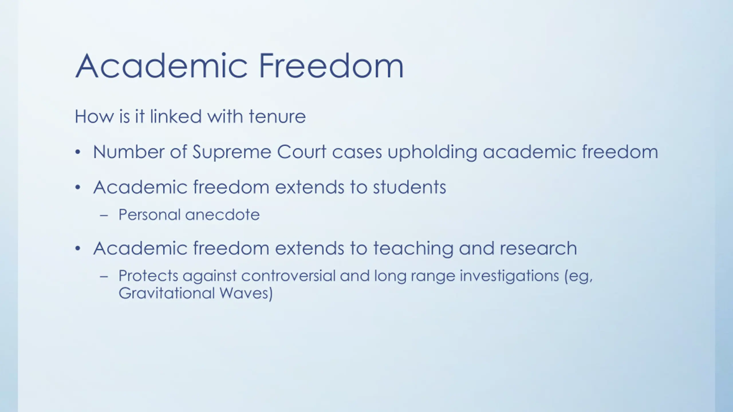 Academic Freedom How is it linked with tenure Number of Supreme Court cases upholding academic freedom Academic freedom extends to students Personal anecdote Academic freedom extends to teaching and research Protects against controversial and long range investigations (eg, Gravitational Waves)
