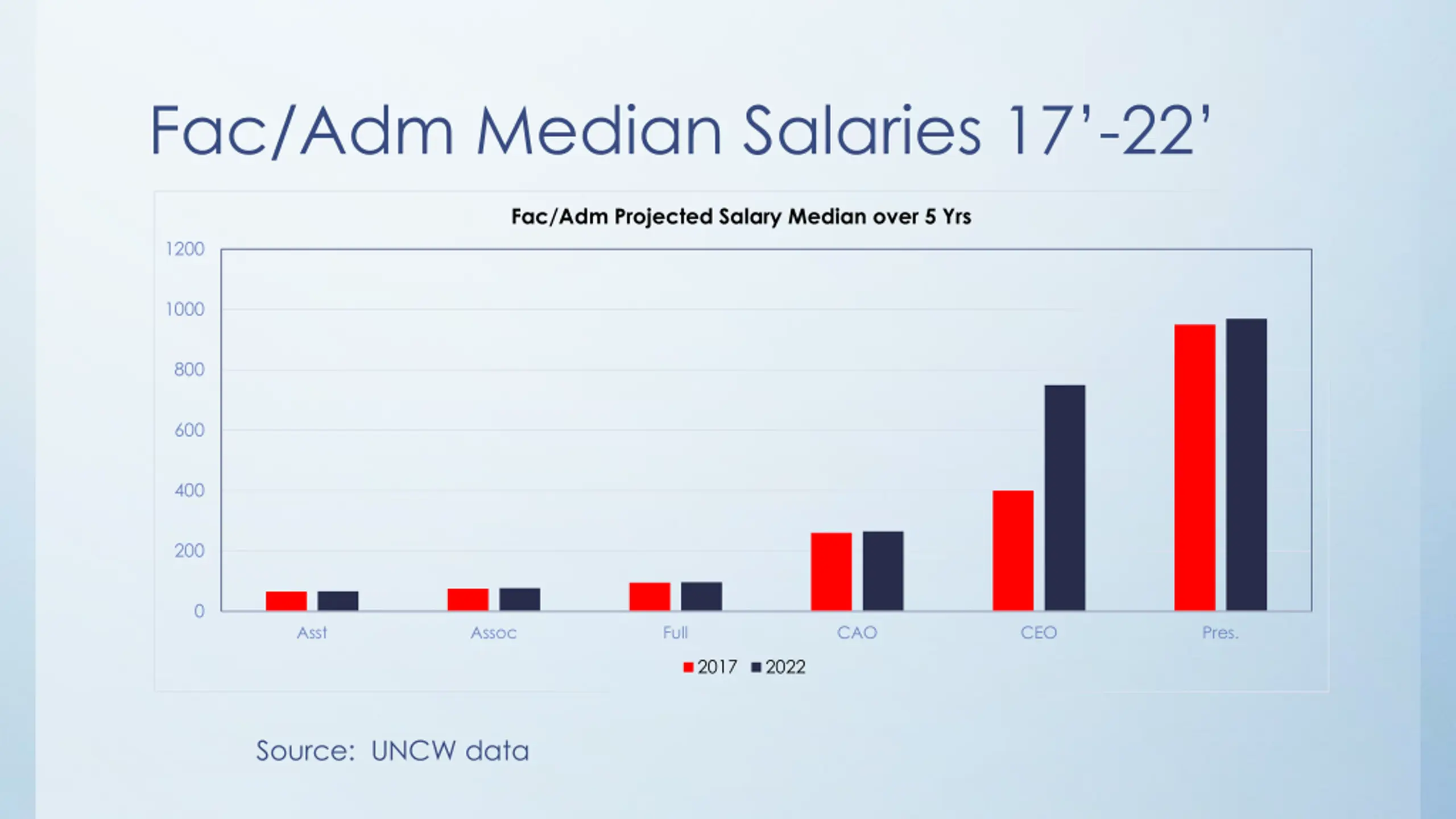 Fac/Adm Median Salaries 17-22 Fac/Adm Projected Salary Median over 5 Yrs 1200 1000 800 600 400 200 0 Asst Assoc Full CAO CEO Pres. 2017 2022 Source: UNCW data