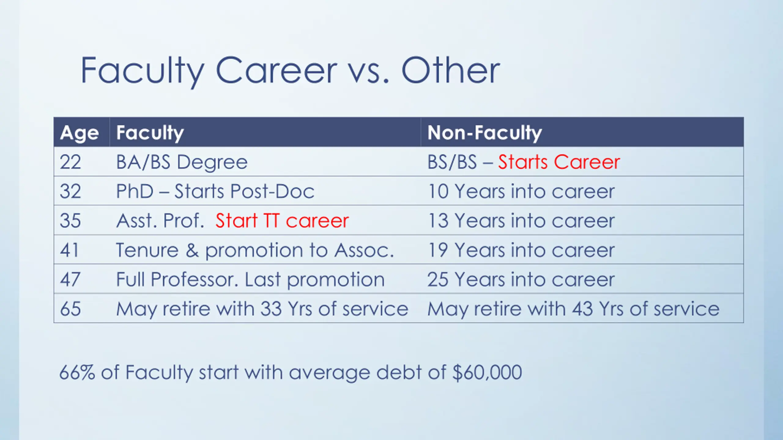 Faculty Career vs. Other Age Faculty 22 BA/BS Degree 32 PhD Starts Post-Doc 35 Asst. Prof. Start TT career 41 Tenure & promotion to Assoc. 47 Full Professor. Last promotion 65 May retire with 33 Yrs of service Non-Faculty BS/BS Starts Career 10 Years into career 13 Years into career 19 Years into career 25 Years into career May retire with 43 Yrs of service 66% of Faculty start with average debt of $60,000