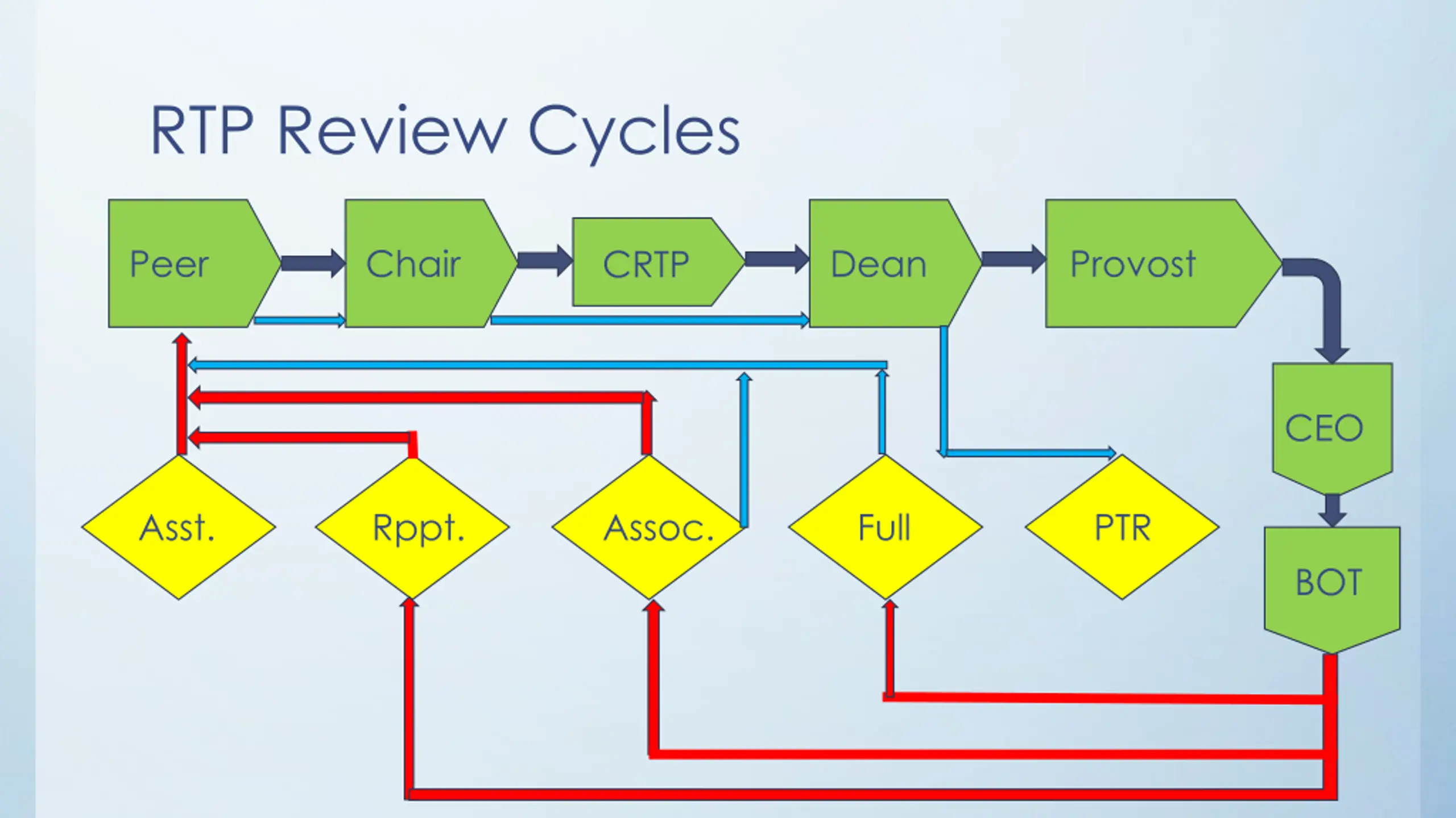 RTP Review Cycles Peer Chair Dean Provost CRTP CEO Asst. Rppt. Assoc. Full PTR BOT
