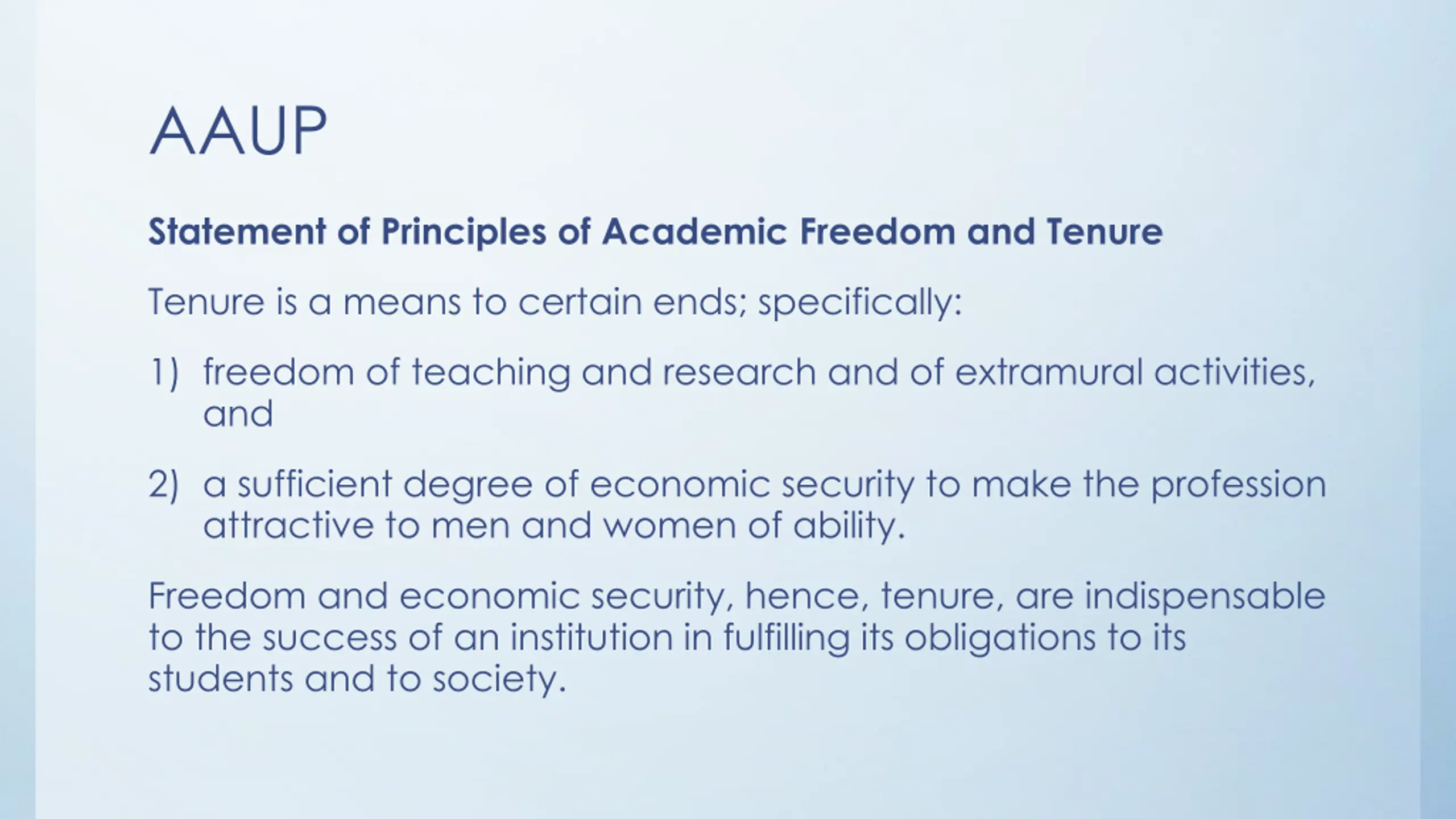 AAUP Statement of Principles of Academic Freedom and Tenure Tenure is a means to certain ends; specifically: 1) freedom of teaching and research and of extramural activities, and 2) a sufficient degree of economic security to make the profession attractive to men and women of ability. Freedom and economic security, hence, tenure, are indispensable to the success of an institution in fulfilling its obligations to its students and to society.