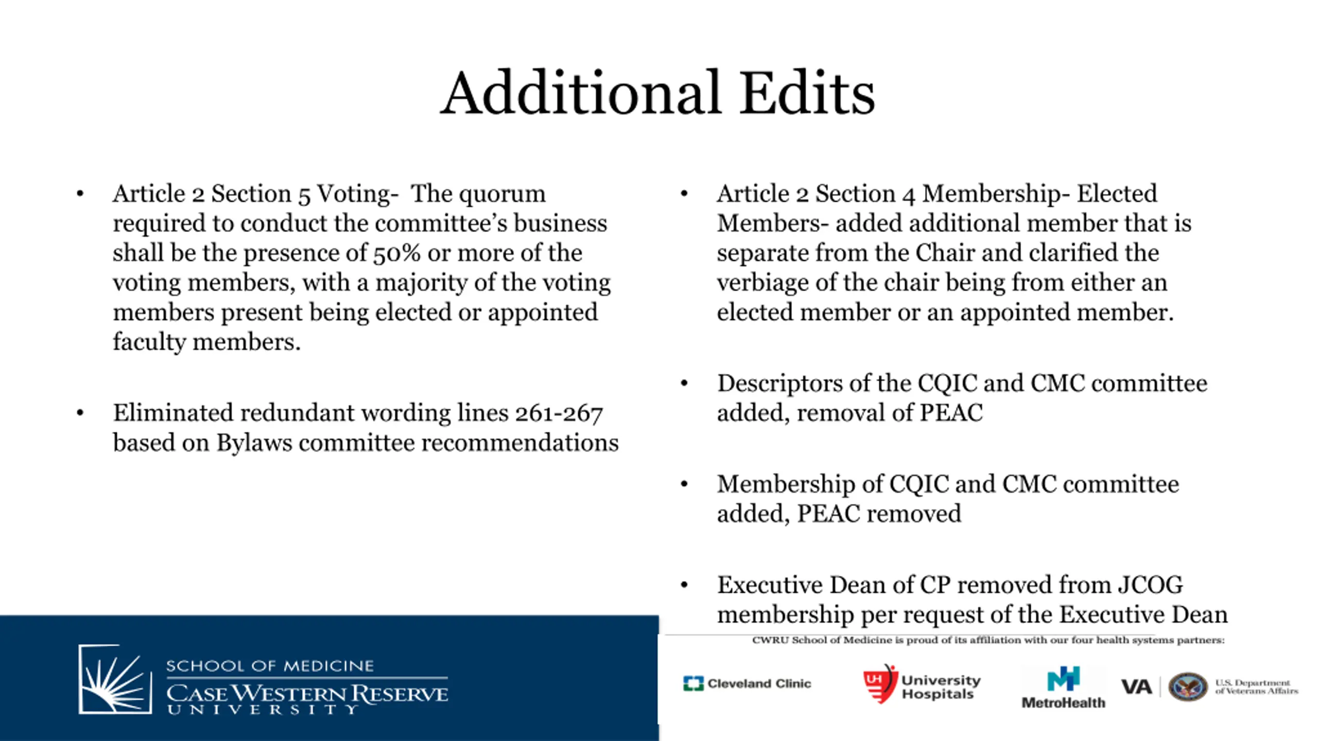 Additional Edits Article 2 Section 5 Voting- The quorum required to conduct the committee s business shall be the presence of 50% or more of the voting members, with a majority of the voting members present being elected or appointed faculty members. Article 2 Section 4 Membership- Elected Members- added additional member that is separate from the Chair and clarified the verbiage of the chair being from either an elected member or an appointed member. Descriptors of the CQIC and CMC committee added, removal of PEAC Eliminated redundant wording lines 261-267 based on Bylaws committee recommendations Membership of CQIC and CMC committee added, PEAC removed Executive Dean of CP removed from JCOG membership per request of the Executive Dean
