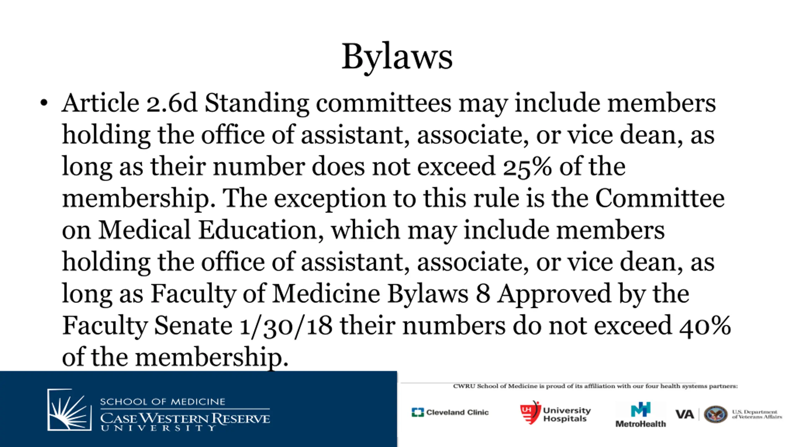 Bylaws Article 2.6d Standing committees may include members holding the office of assistant, associate, or vice dean, as long as their number does not exceed 25% of the membership. The exception to this rule is the Committee on Medical Education, which may include members holding the office of assistant, associate, or vice dean, as long as Faculty of Medicine Bylaws 8 Approved by the Faculty Senate 1/30/18 their numbers do not exceed 40% of the membership.