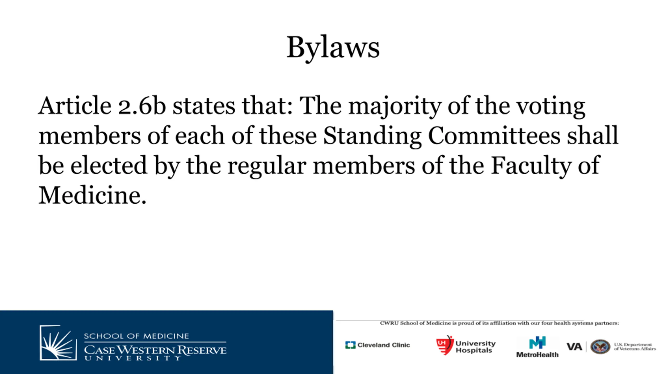 Bylaws Article 2.6b states that: The majority of the voting members of each of these Standing Committees shall be elected by the regular members of the Faculty of Medicine.