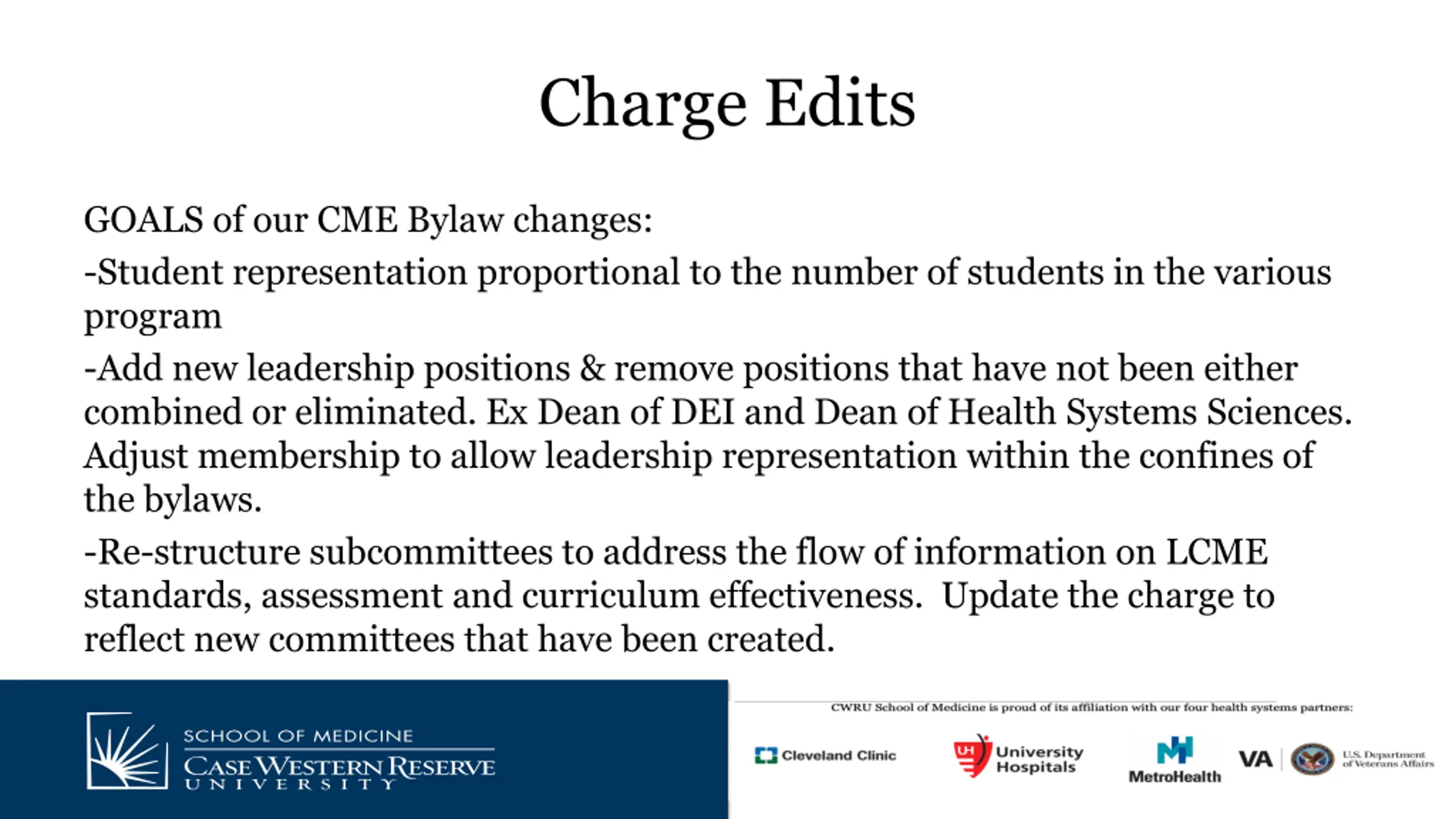 Charge Edits GOALS of our CME Bylaw changes: -Student representation proportional to the number of students in the various program -Add new leadership positions & remove positions that have not been either combined or eliminated. Ex Dean of DEI and Dean of Health Systems Sciences. Adjust membership to allow leadership representation within the confines of the bylaws. -Re-structure subcommittees to address the flow of information on LCME standards, assessment and curriculum effectiveness. Update the charge to reflect new committees that have been created.