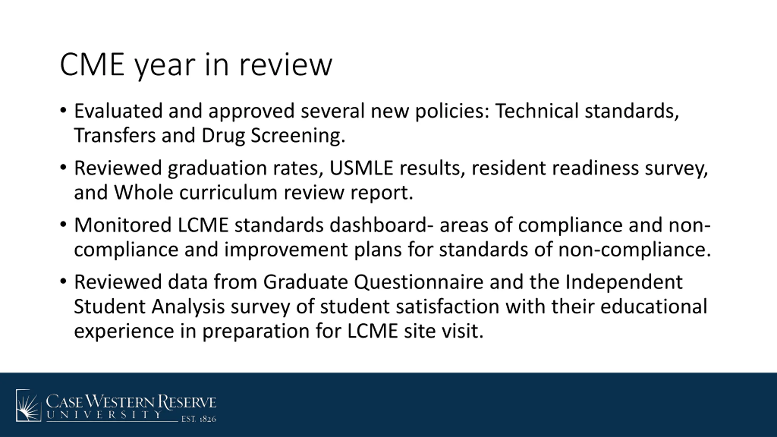 CME year in review Evaluated and approved several new policies: Technical standards, Transfers and Drug Screening. Reviewed graduation rates, USMLE results, resident readiness survey, and Whole curriculum review report. Monitored LCME standards dashboard- areas of compliance and non- compliance and improvement plans for standards of non-compliance. Reviewed data from Graduate Questionnaire and the Independent Student Analysis survey of student satisfaction with their educational experience in preparation for LCME site visit.