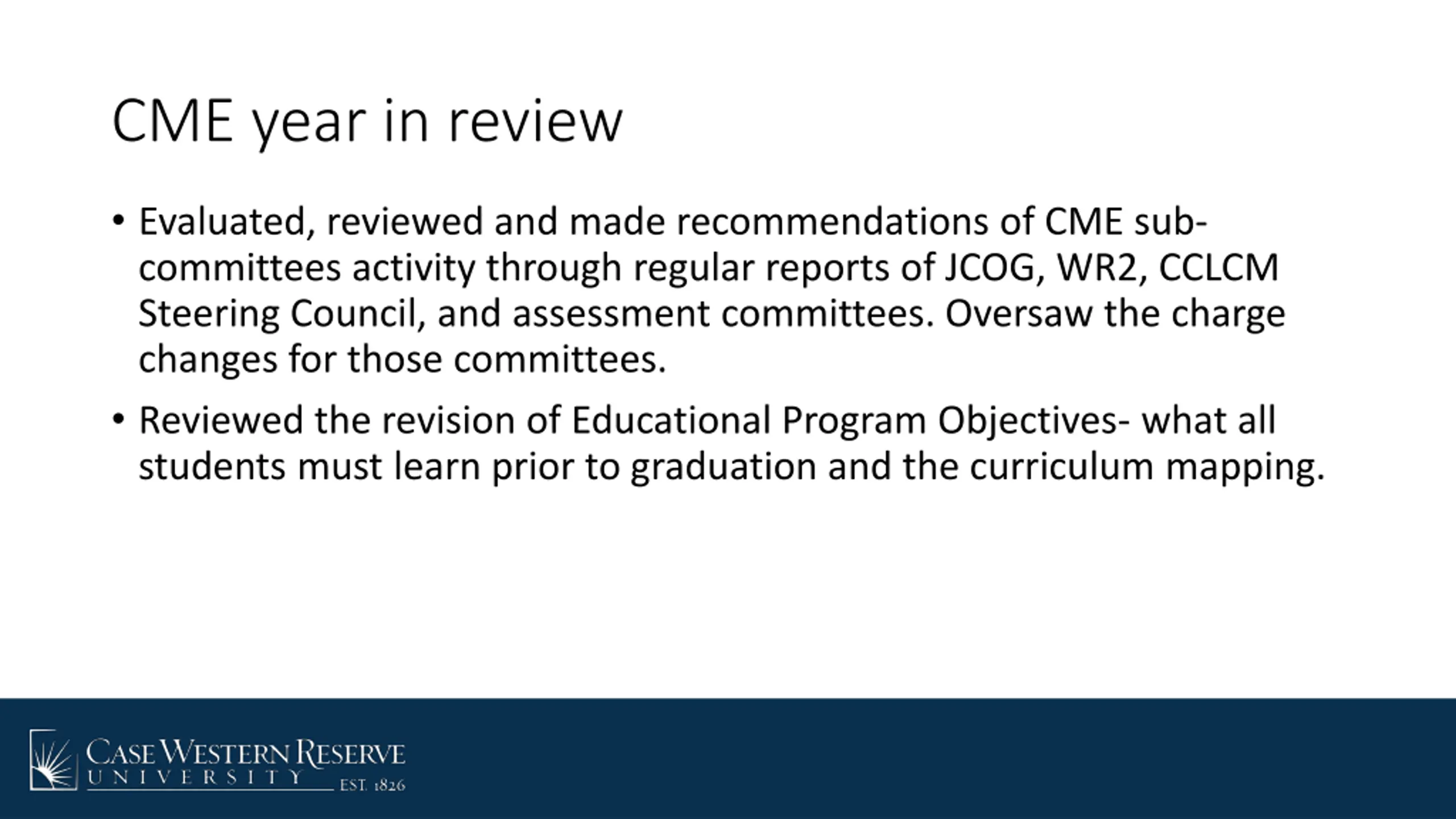 CME year in review Evaluated, reviewed and made recommendations of CME sub- committees activity through regular reports of JCOG, WR2, CCLCM Steering Council, and assessment committees. Oversaw the charge changes for those committees. Reviewed the revision of Educational Program Objectives- what all students must learn prior to graduation and the curriculum mapping.