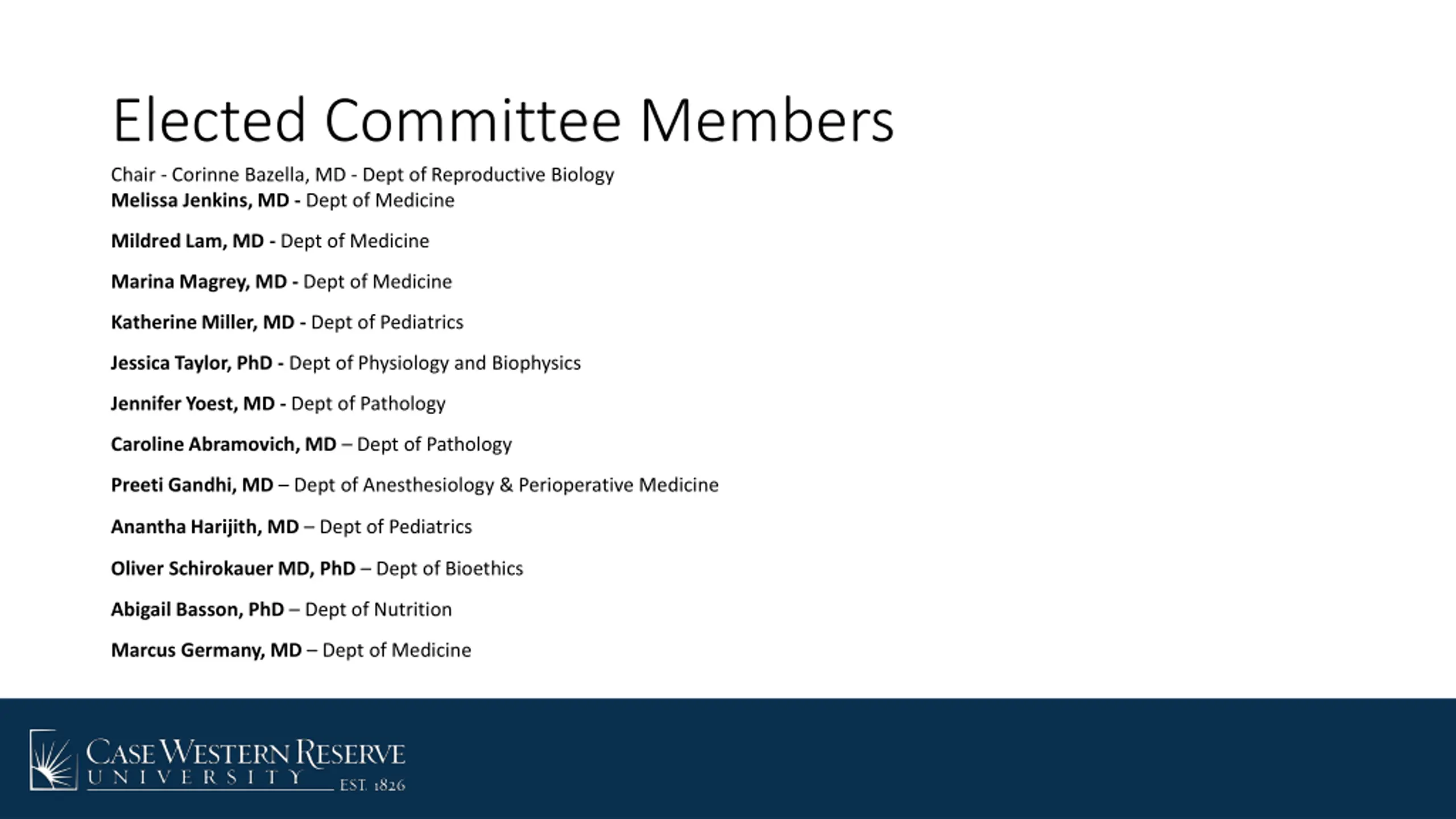 Elected Committee Members Chair - Corinne Bazella, MD - Dept of Reproductive Biology Melissa Jenkins, MD - Dept of Medicine Mildred Lam, MD - Dept of Medicine Marina Magrey, MD - Dept of Medicine Katherine Miller, MD - Dept of Pediatrics Jessica Taylor, PhD - Dept of Physiology and Biophysics Jennifer Yoest, MD - Dept of Pathology Caroline Abramovich, MD Dept of Pathology Preeti Gandhi, MD Dept of Anesthesiology & Perioperative Medicine Anantha Harijith, MD Dept of Pediatrics Oliver Schirokauer MD, PhD Dept of Bioethics Abigail Basson, PhD Dept of Nutrition Marcus Germany, MD Dept of Medicine