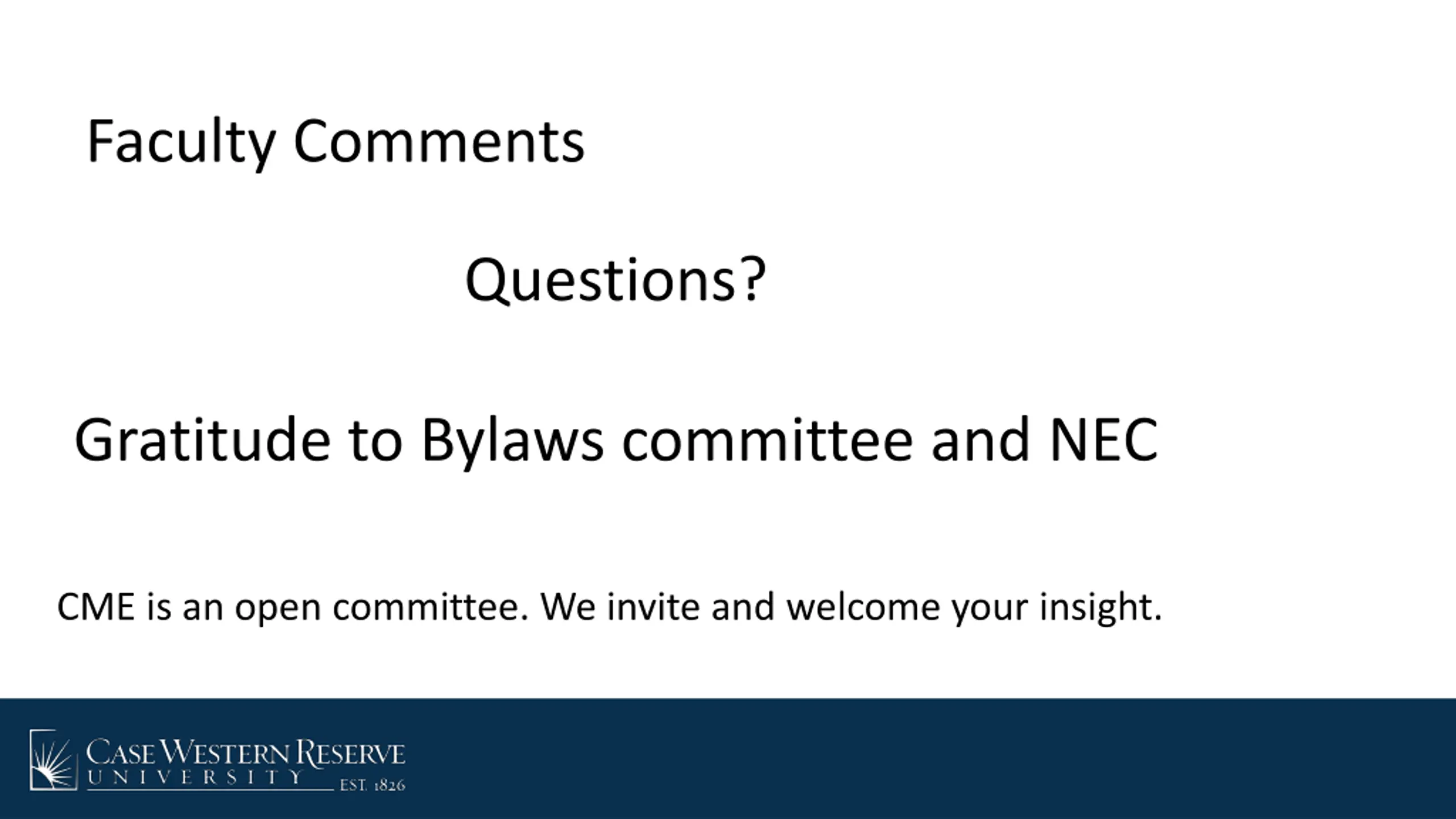 Faculty Comments Questions? Gratitude to Bylaws committee and NEC CME is an open committee. We invite and welcome your insight.