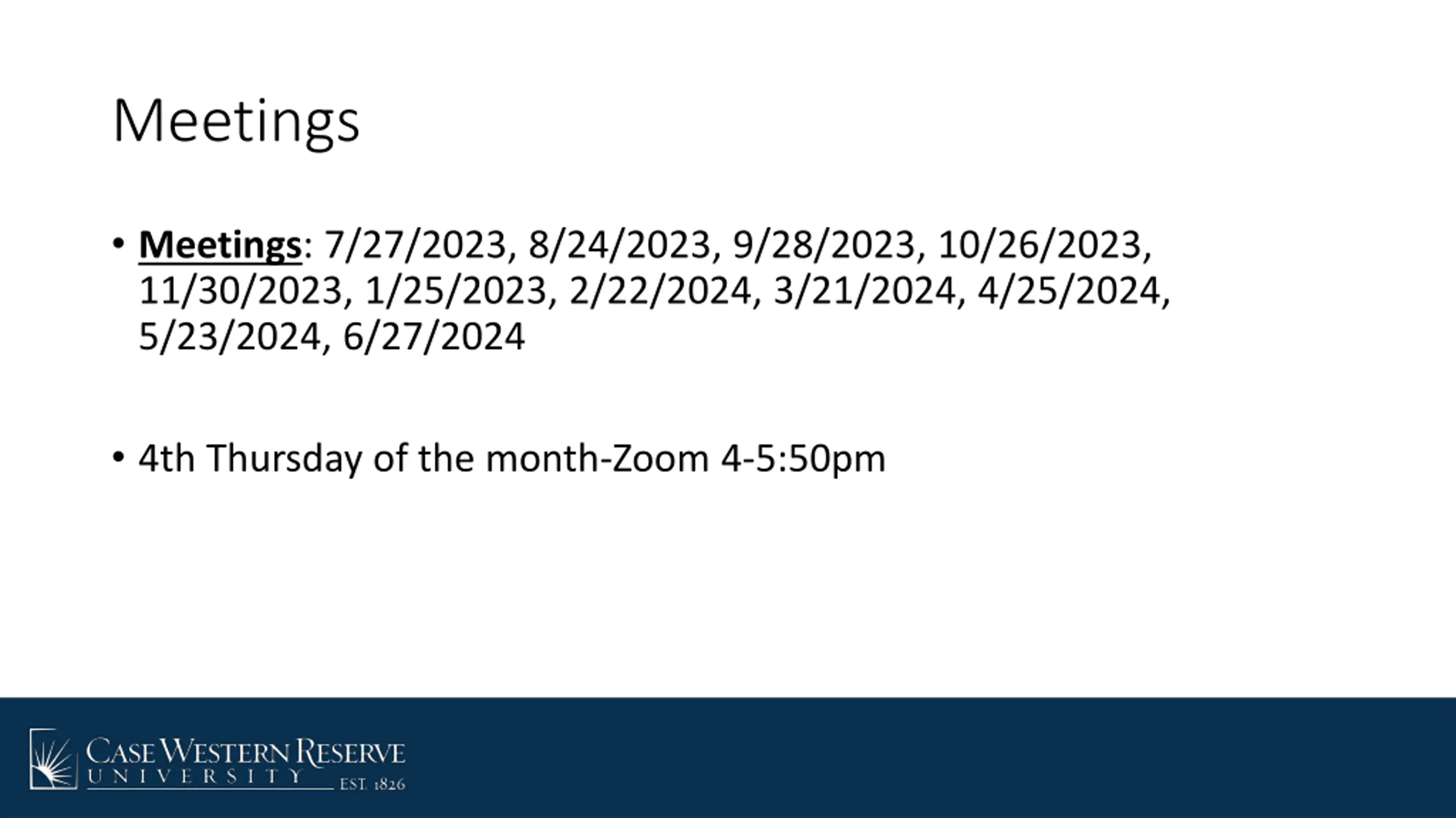Meetings Meetings: 7/27/2023, 8/24/2023, 9/28/2023, 10/26/2023, 11/30/2023, 1/25/2023, 2/22/2024, 3/21/2024, 4/25/2024, 5/23/2024, 6/27/2024 4th Thursday of the month-Zoom 4-5:50pm