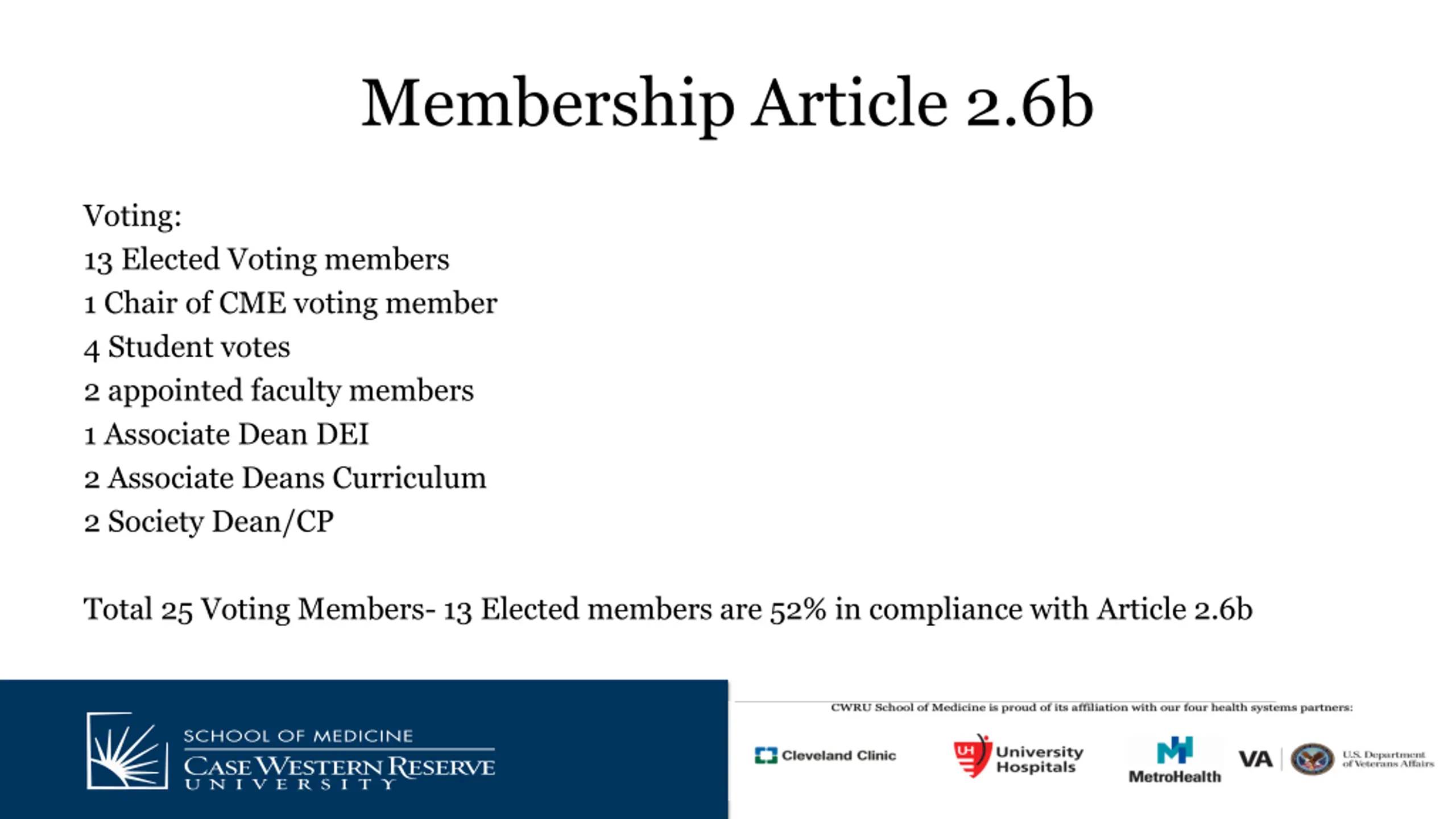 Membership Article 2.6b Voting: 13 Elected Voting members 1 Chair of CME voting member 4 Student votes 2 appointed faculty members 1 Associate Dean DEI 2 Associate Deans Curriculum 2 Society Dean/CP Total 25 Voting Members- 13 Elected members are 52% in compliance with Article 2.6b