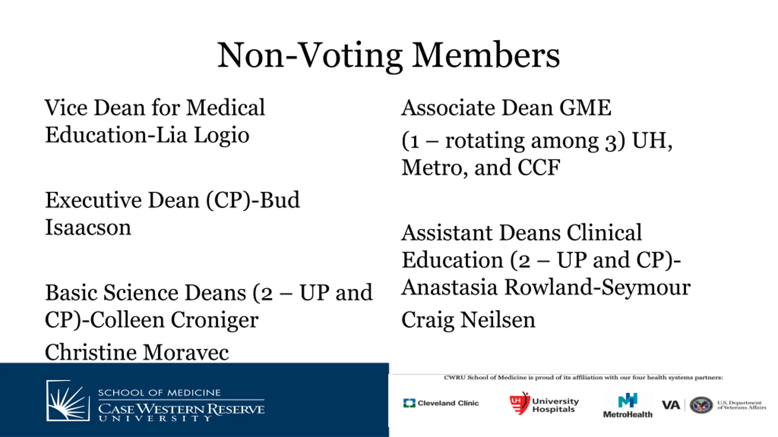 Non-Voting Members Vice Dean for Medical Education-Lia Logio Associate Dean GME (1 rotating among 3) UH, Metro, and CCF Executive Dean (CP)-Bud Isaacson Assistant Deans Clinical Education (2 UP and CP)- Anastasia Rowland-Seymour Craig Neilsen Basic Science Deans (2 UP and CP)-Colleen Croniger Christine Moravec