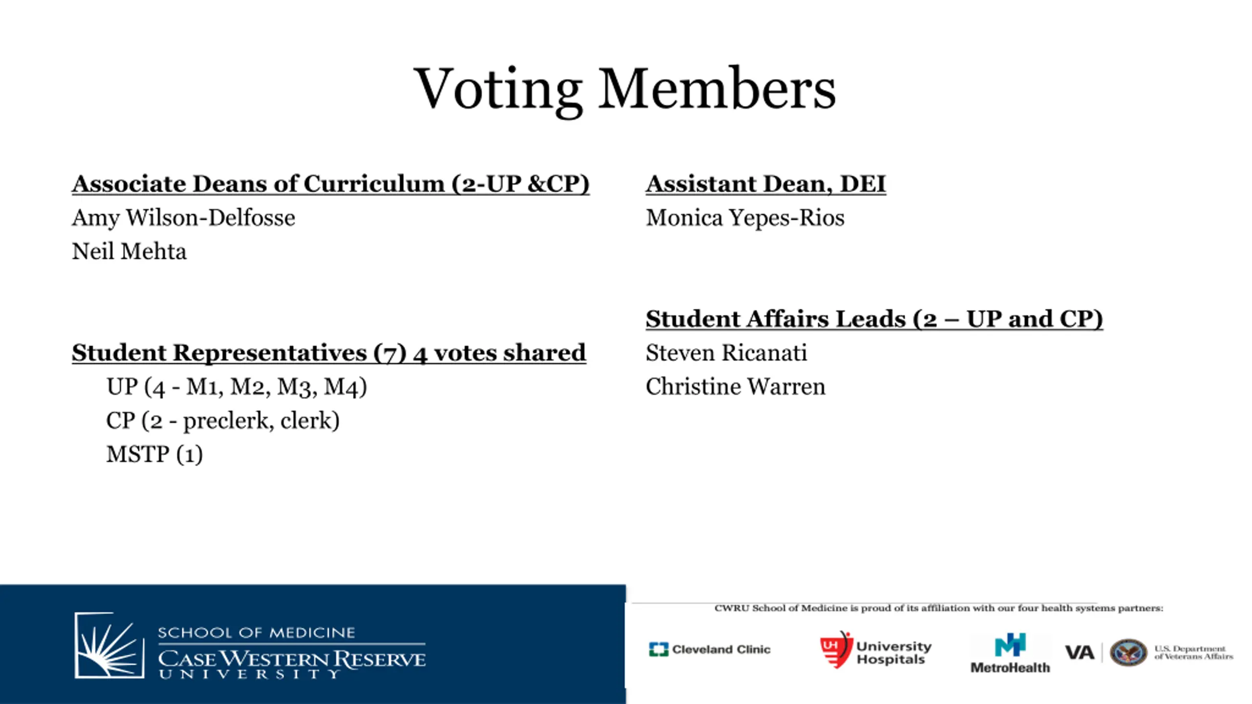 Voting Members Associate Deans of Curriculum (2-UP &CP) Amy Wilson-Delfosse Neil Mehta Assistant Dean, DEI Monica Yepes-Rios Student Affairs Leads (2 UP and CP) Steven Ricanati Christine Warren Student Representatives (7) 4 votes shared UP (4 - M1, M2, M3, M4) CP (2 - preclerk, clerk) MSTP (1)