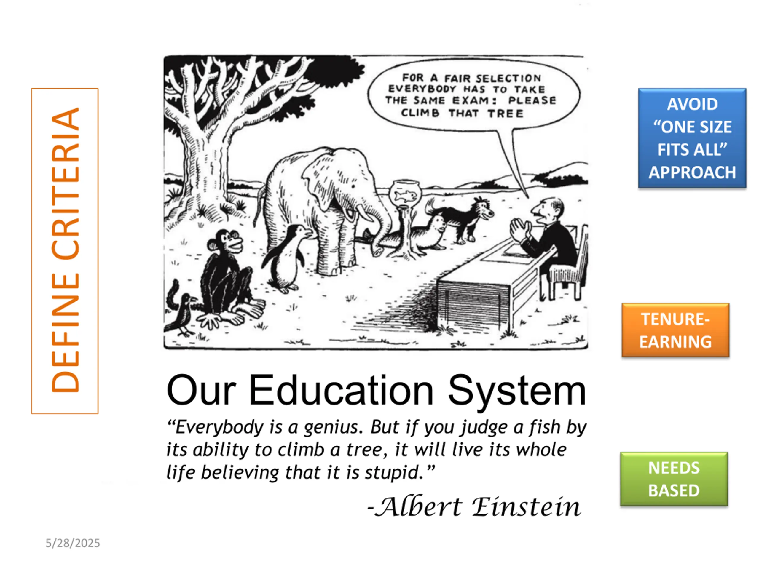 AVOID ONE SIZE FITS ALL APPROACH DEFINE CRITERIA TENURE- EARNING Our Education System Everybody is a genius. But if you judge a fish by its ability to climb a tree, it will live its whole life believing that it is stupid. -Albert Einstein NEEDS BASED 5/28/2025