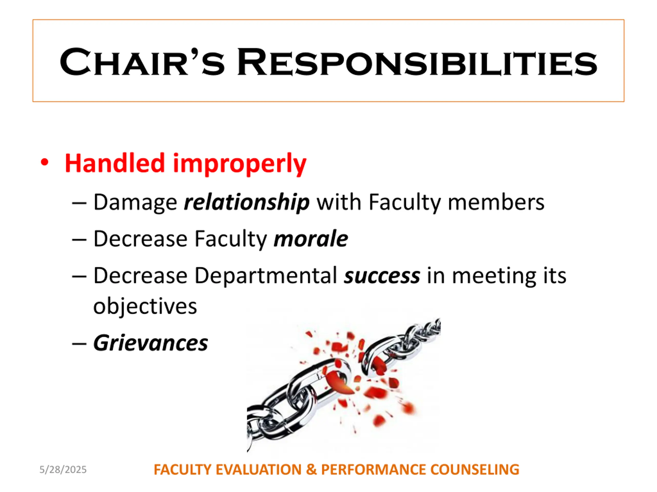 Chairs Responsibilities Handled improperly Damage relationship with Faculty members Decrease Faculty morale Decrease Departmental success in meeting its objectives Grievances FACULTY EVALUATION & PERFORMANCE COUNSELING 5/28/2025