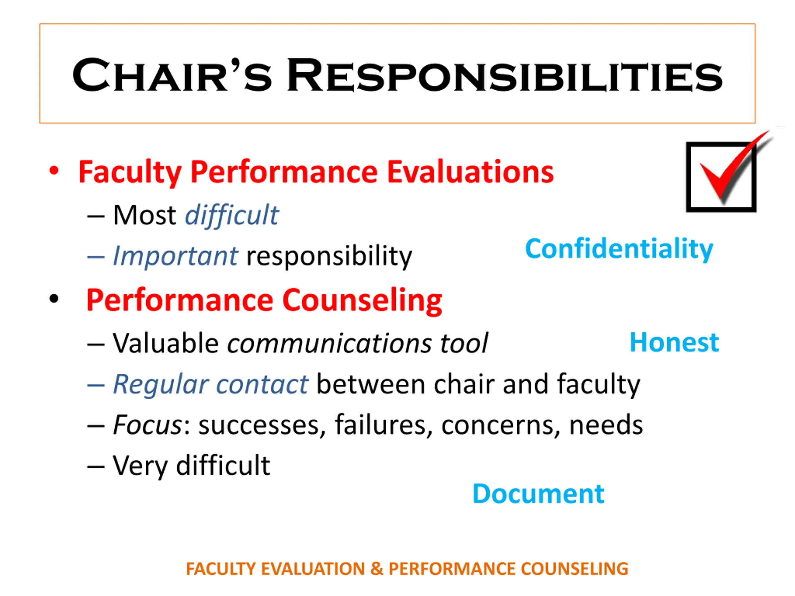 Chairs Responsibilities Faculty Performance Evaluations Most difficult Important responsibility Performance Counseling Valuable communications tool Regular contact between chair and faculty Focus: successes, failures, concerns, needs Very difficult Confidentiality Honest Document FACULTY EVALUATION & PERFORMANCE COUNSELING