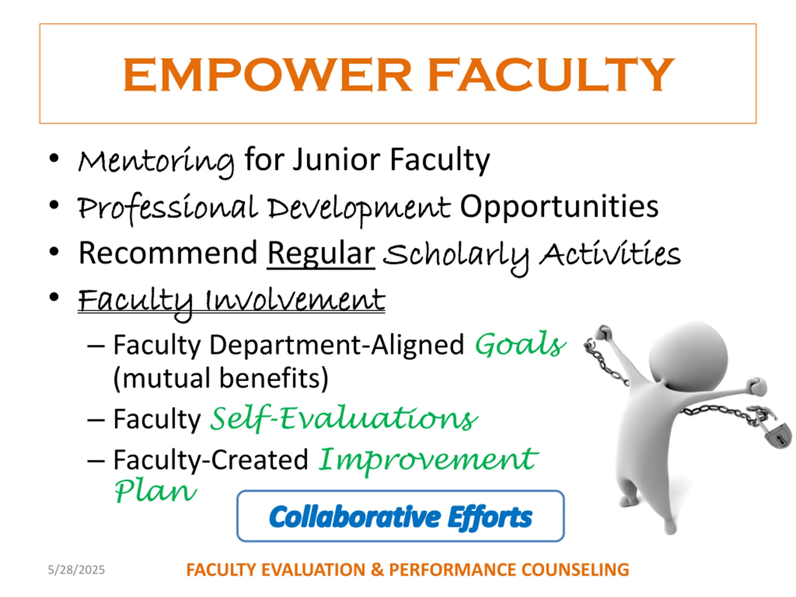 EMPOWER FACULTY Mentoring Mentoring for Junior Faculty Professional Development Professional Development Opportunities Recommend Regular Scholarly Activities Faculty Involvement Faculty Involvement Faculty Department-Aligned Goals (mutual benefits) Faculty Self-Evaluations Faculty-Created Improvement Plan Collaborative Efforts Scholarly Activities FACULTY EVALUATION & PERFORMANCE COUNSELING 5/28/2025