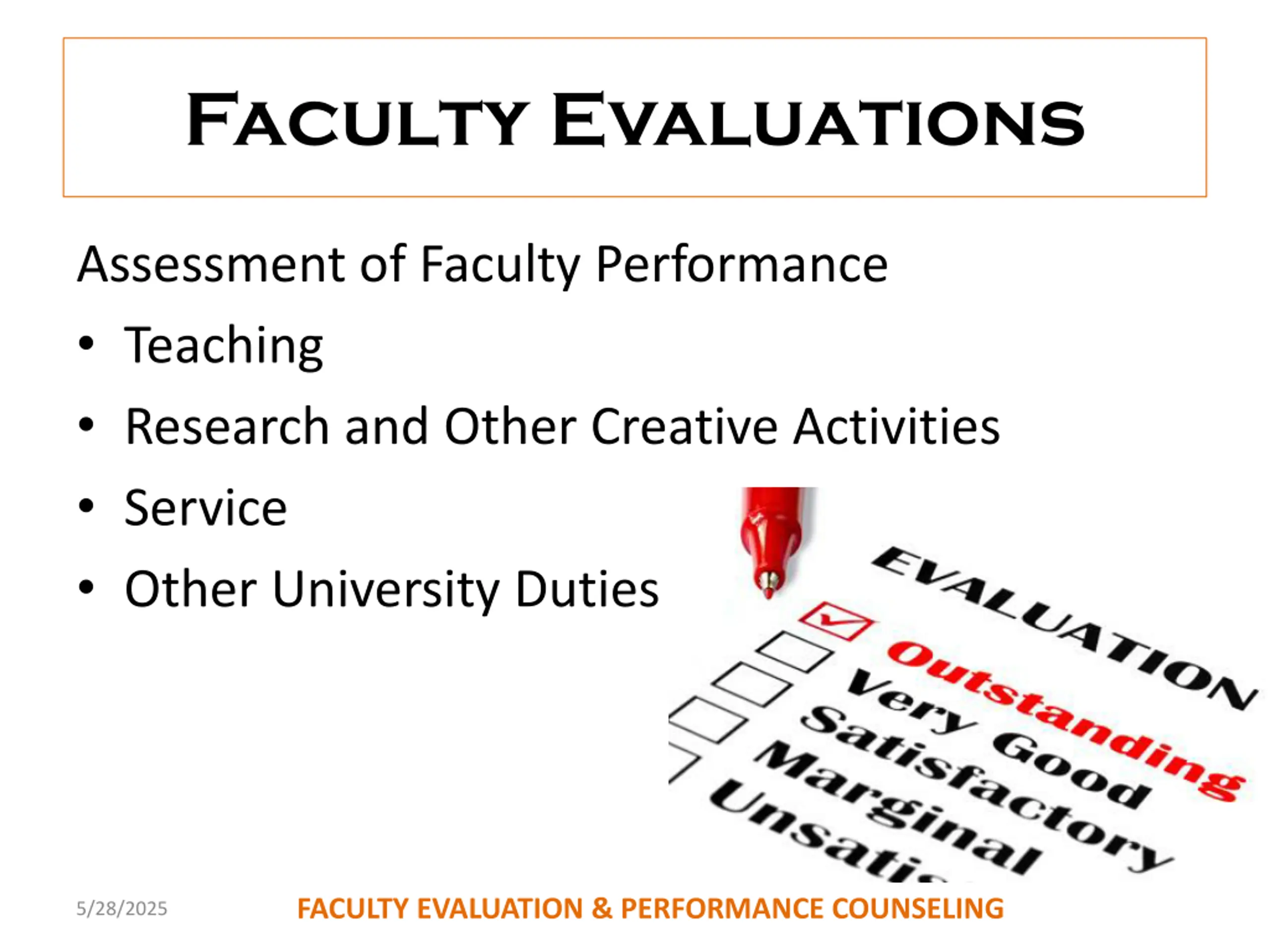 Faculty Evaluations Assessment of Faculty Performance Teaching Research and Other Creative Activities Service Other University Duties FACULTY EVALUATION & PERFORMANCE COUNSELING 5/28/2025