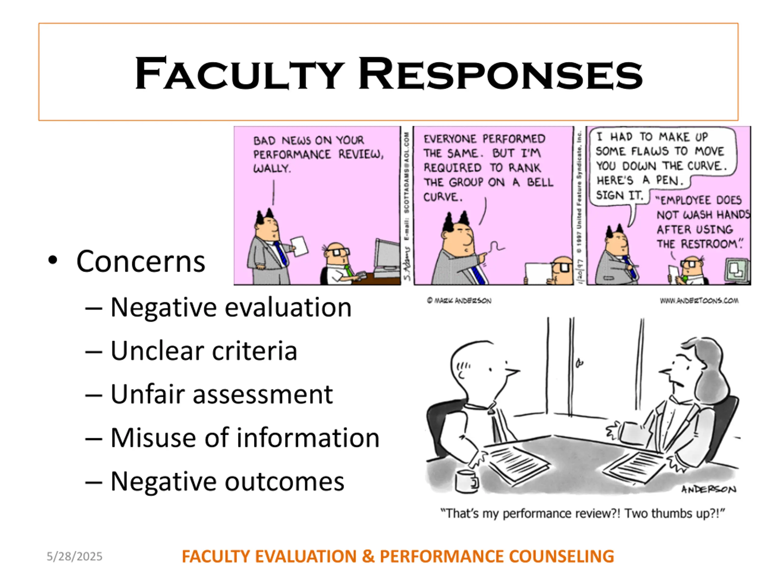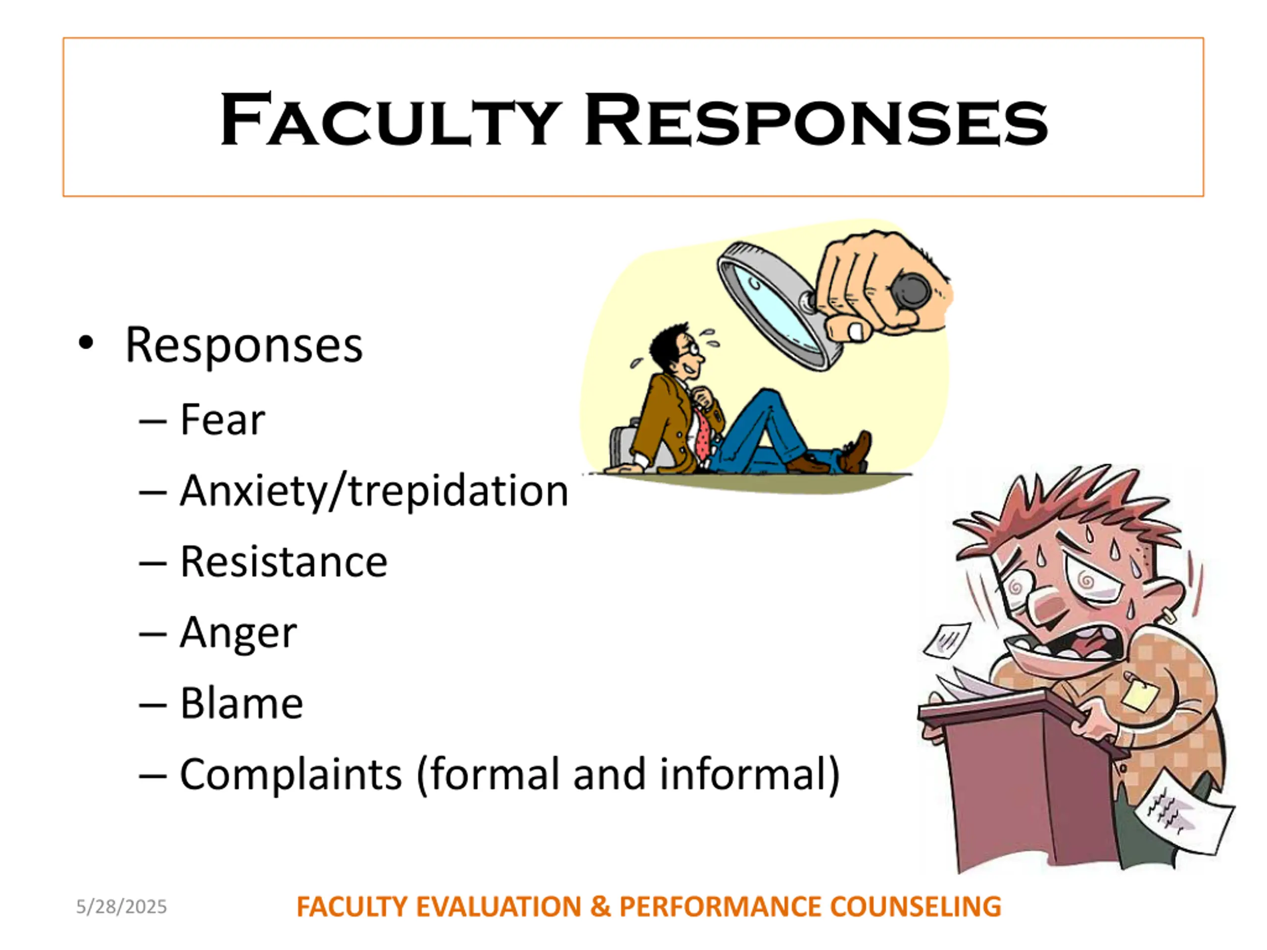 Faculty Responses Responses Fear Anxiety/trepidation Resistance Anger Blame Complaints (formal and informal) FACULTY EVALUATION & PERFORMANCE COUNSELING 5/28/2025