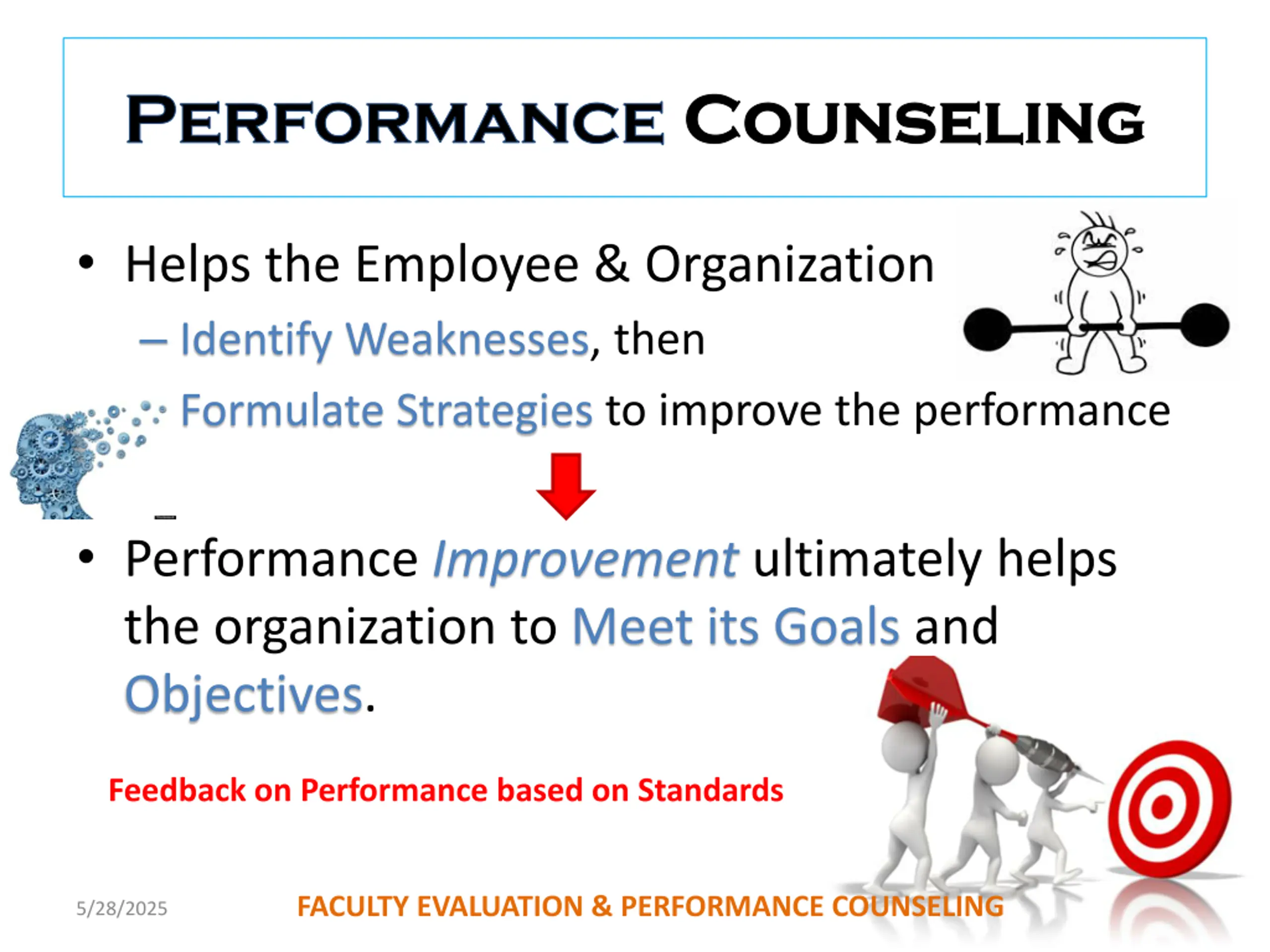 Performance Counseling Helps the Employee & Organization Identify Weaknesses, then Formulate Strategies to improve the performance Performance Improvement ultimately helps the organization to Meet its Goals and Objectives. Feedback on Performance based on Standards FACULTY EVALUATION & PERFORMANCE COUNSELING 5/28/2025
