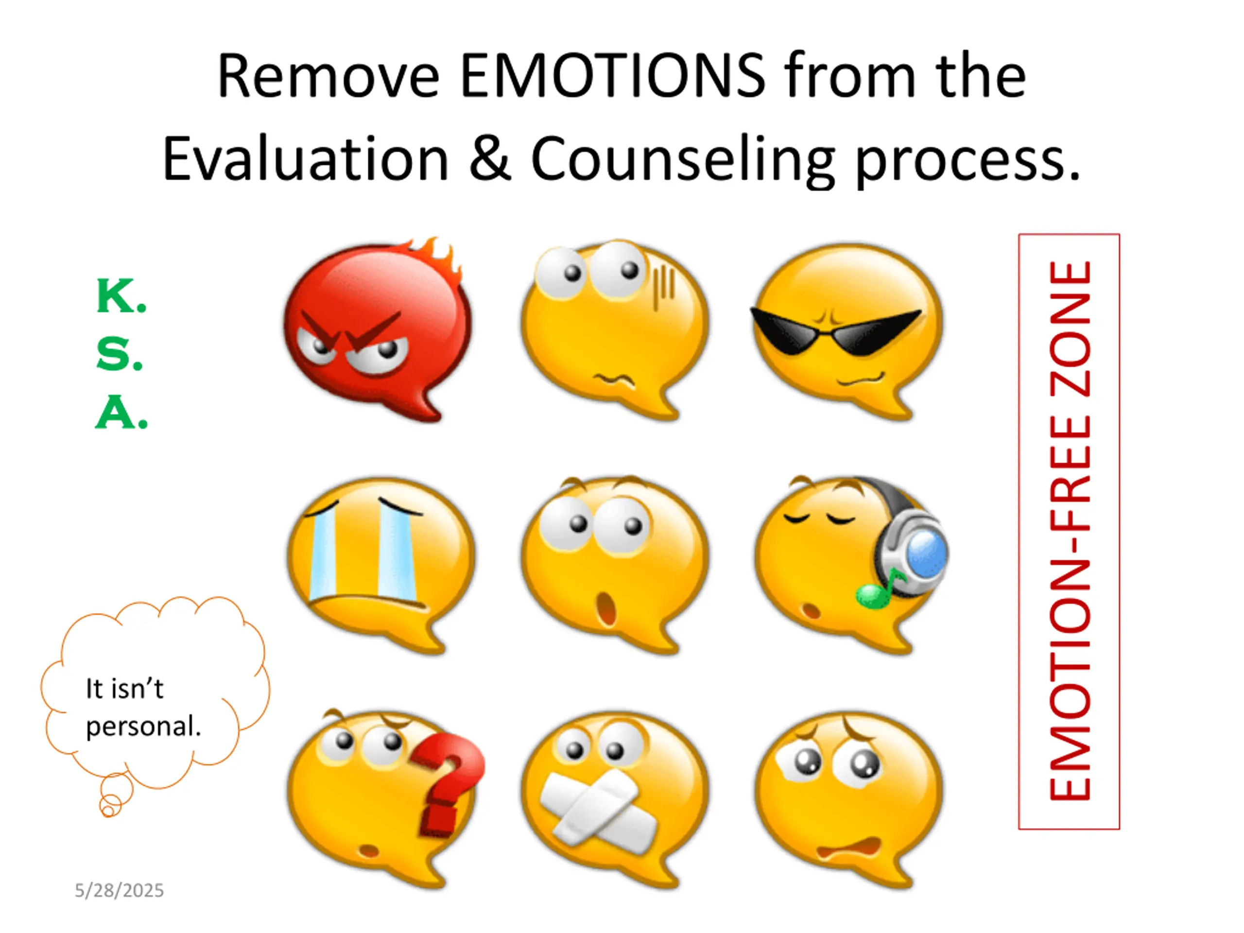 Remove EMOTIONS from the Evaluation & Counseling process. EMOTION-FREE ZONE K. K. S. S. A. A. It isn t personal. 5/28/2025