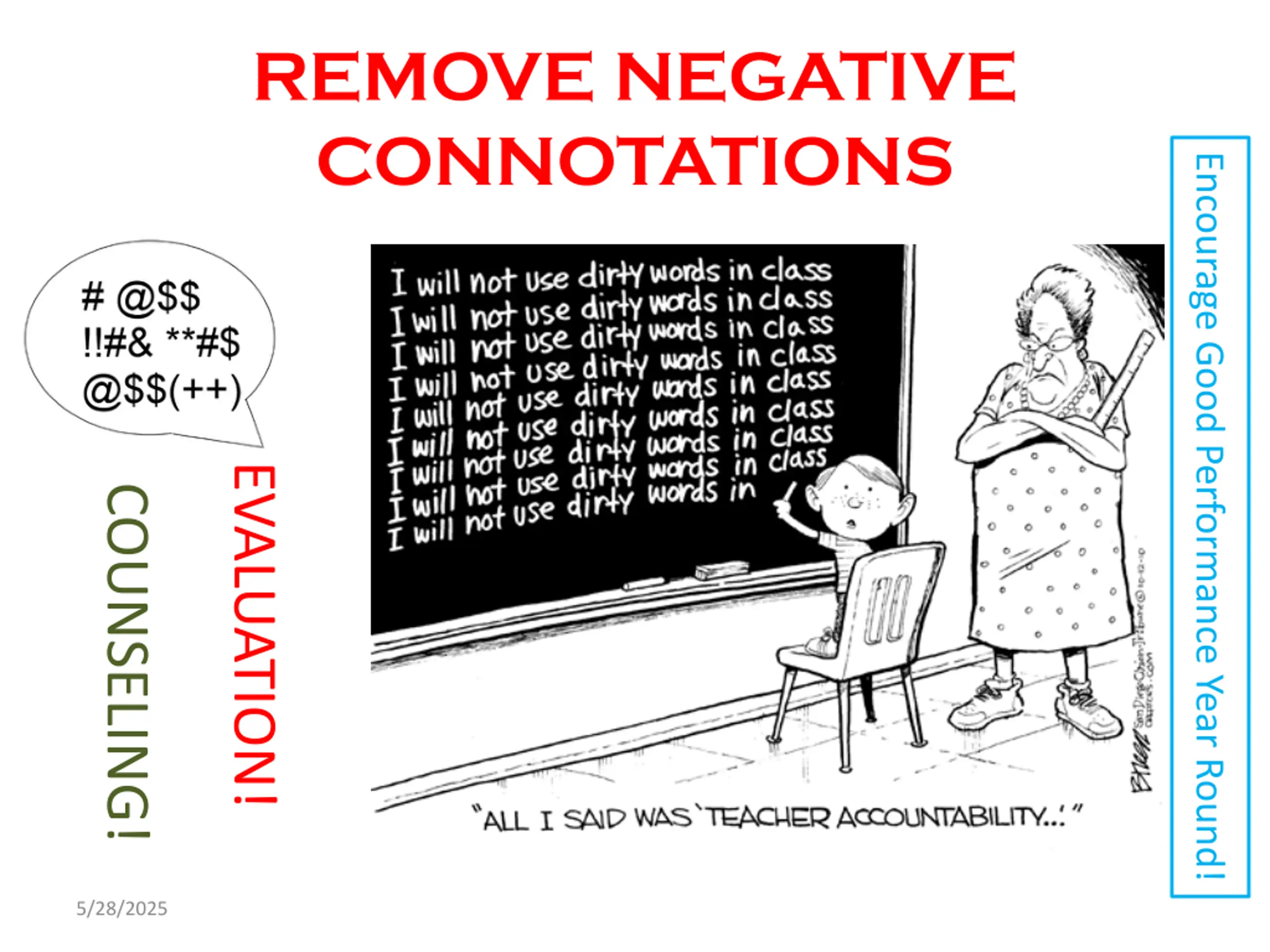REMOVE NEGATIVE CONNOTATIONS Encourage Good Performance Year Round! EVALUATION! COUNSELING! 5/28/2025