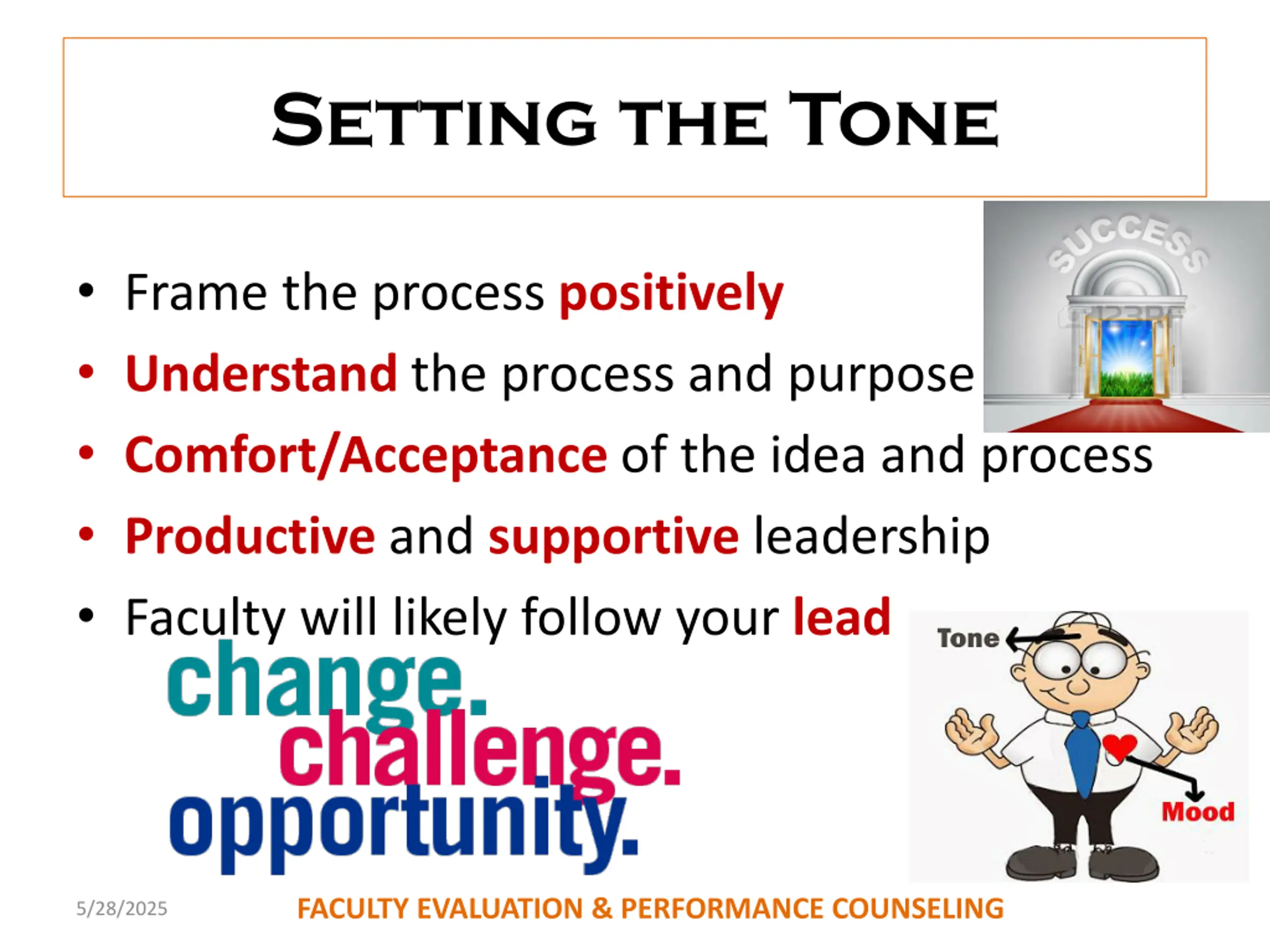 Setting the Tone Frame the process positively Understand the process and purpose Comfort/Acceptance of the idea and process Productive and supportive leadership Faculty will likely follow your lead FACULTY EVALUATION & PERFORMANCE COUNSELING 5/28/2025