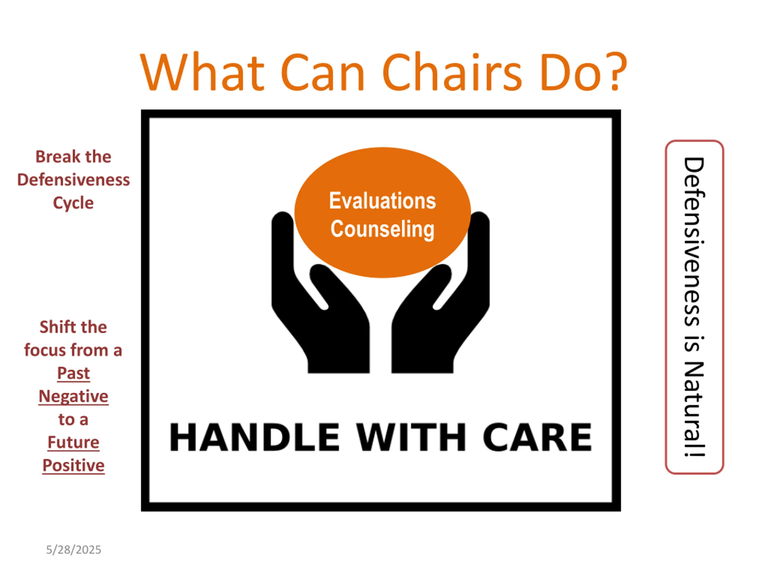 What Can Chairs Do? Break the Defensiveness Cycle Defensiveness is Natural! Evaluations Counseling Shift the focus from a Past Negative to a Future Positive 5/28/2025