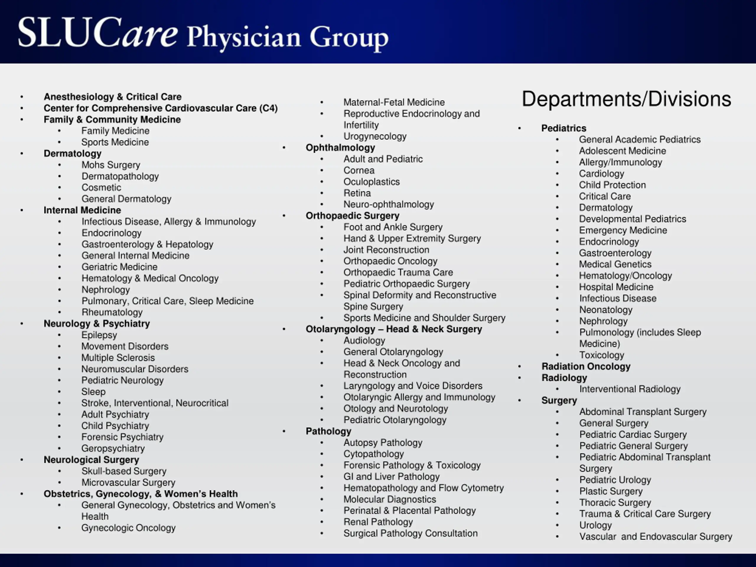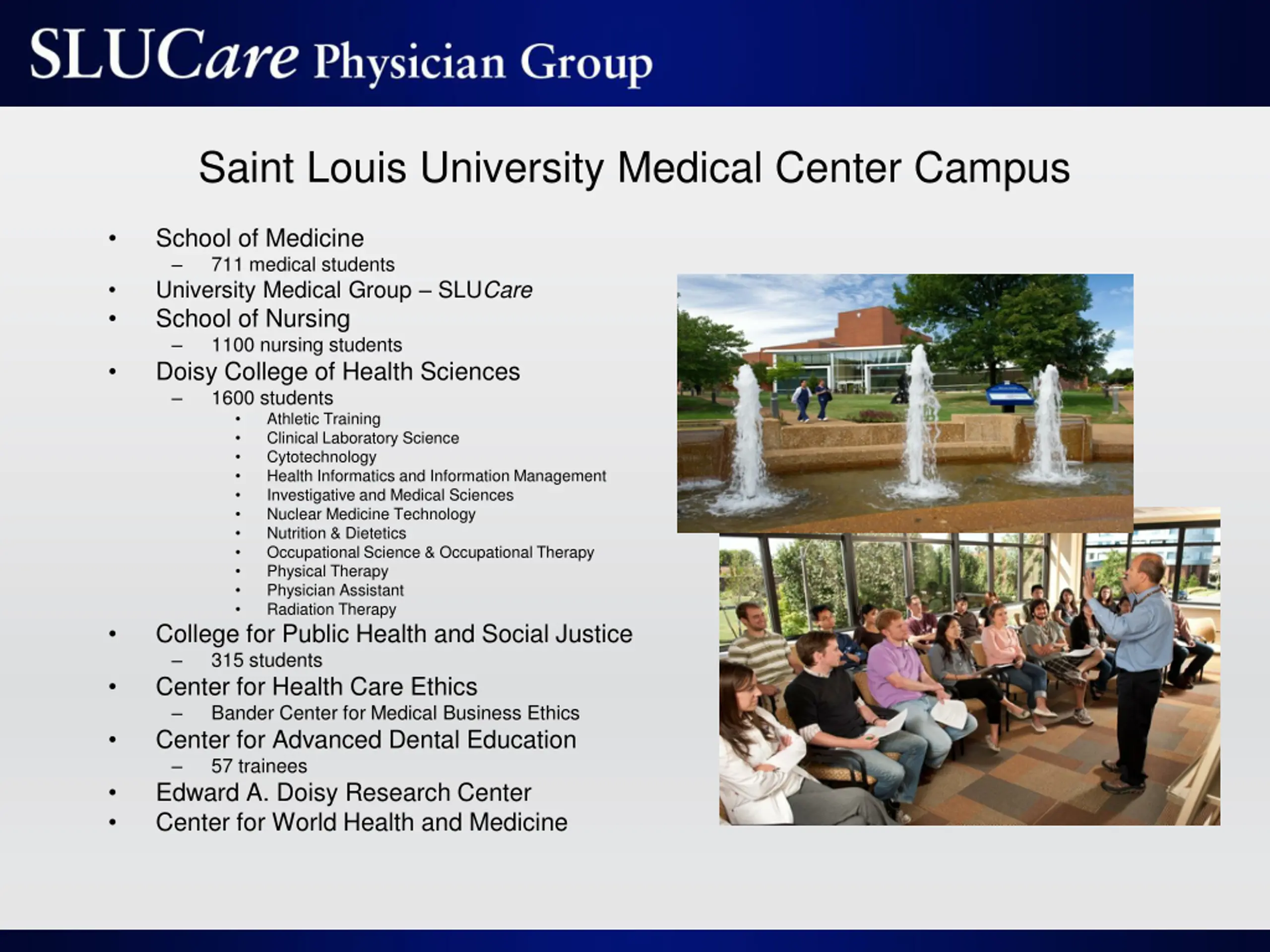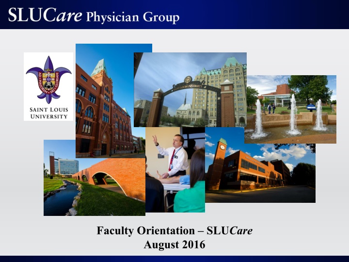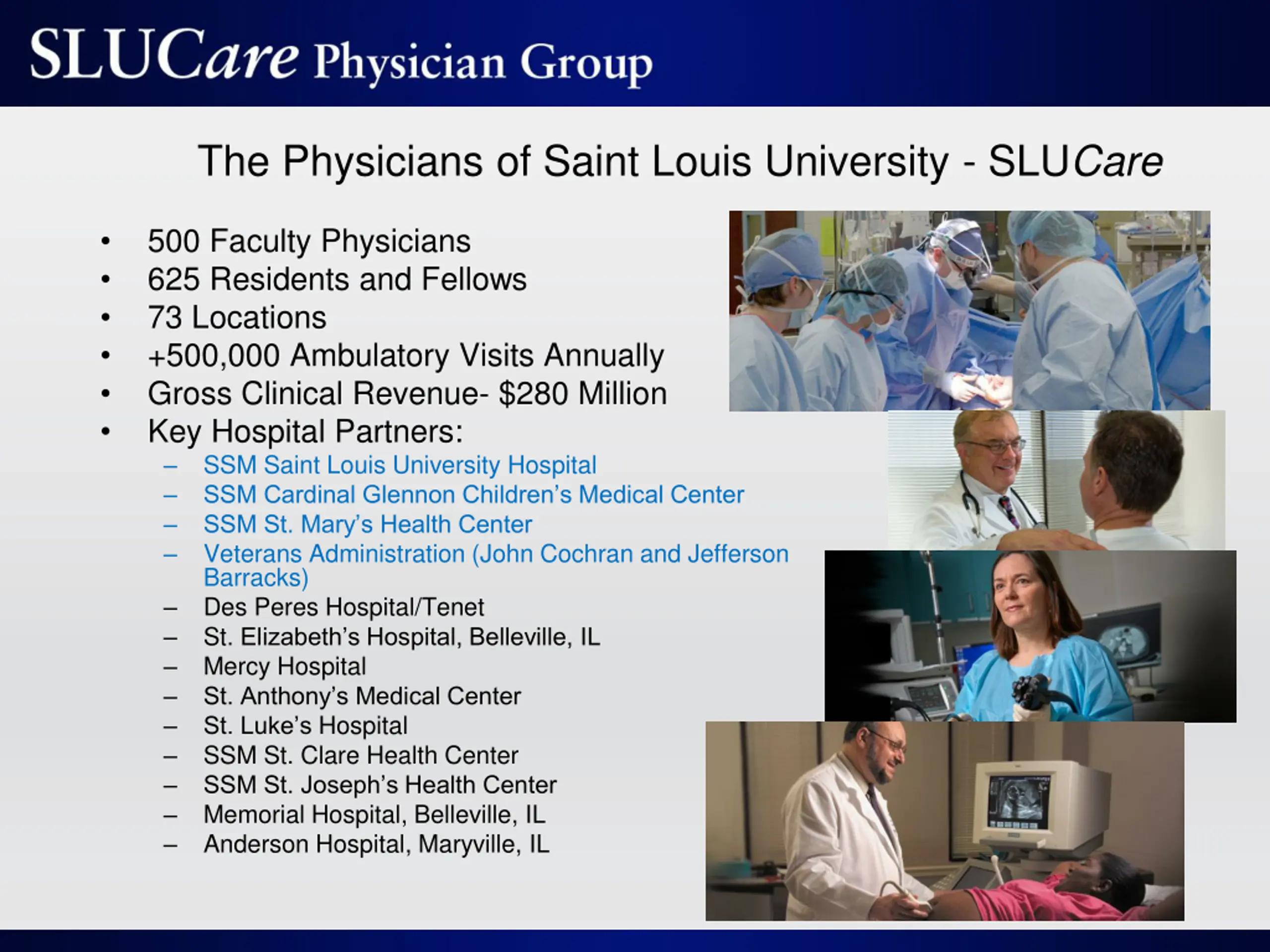 The Physicians of Saint Louis University - SLUCare 500 Faculty Physicians 625 Residents and Fellows 73 Locations +500,000 Ambulatory Visits Annually Gross Clinical Revenue- $280 Million Key Hospital Partners: SSM Saint Louis University Hospital SSM Cardinal Glennon Children s Medical Center SSM St. Mary s Health Center Veterans Administration (John Cochran and Jefferson Barracks) Des Peres Hospital/Tenet St. Elizabeth s Hospital, Belleville, IL Mercy Hospital St. Anthony s Medical Center St. Luke s Hospital SSM St. Clare Health Center SSM St. Joseph s Health Center Memorial Hospital, Belleville, IL Anderson Hospital, Maryville, IL