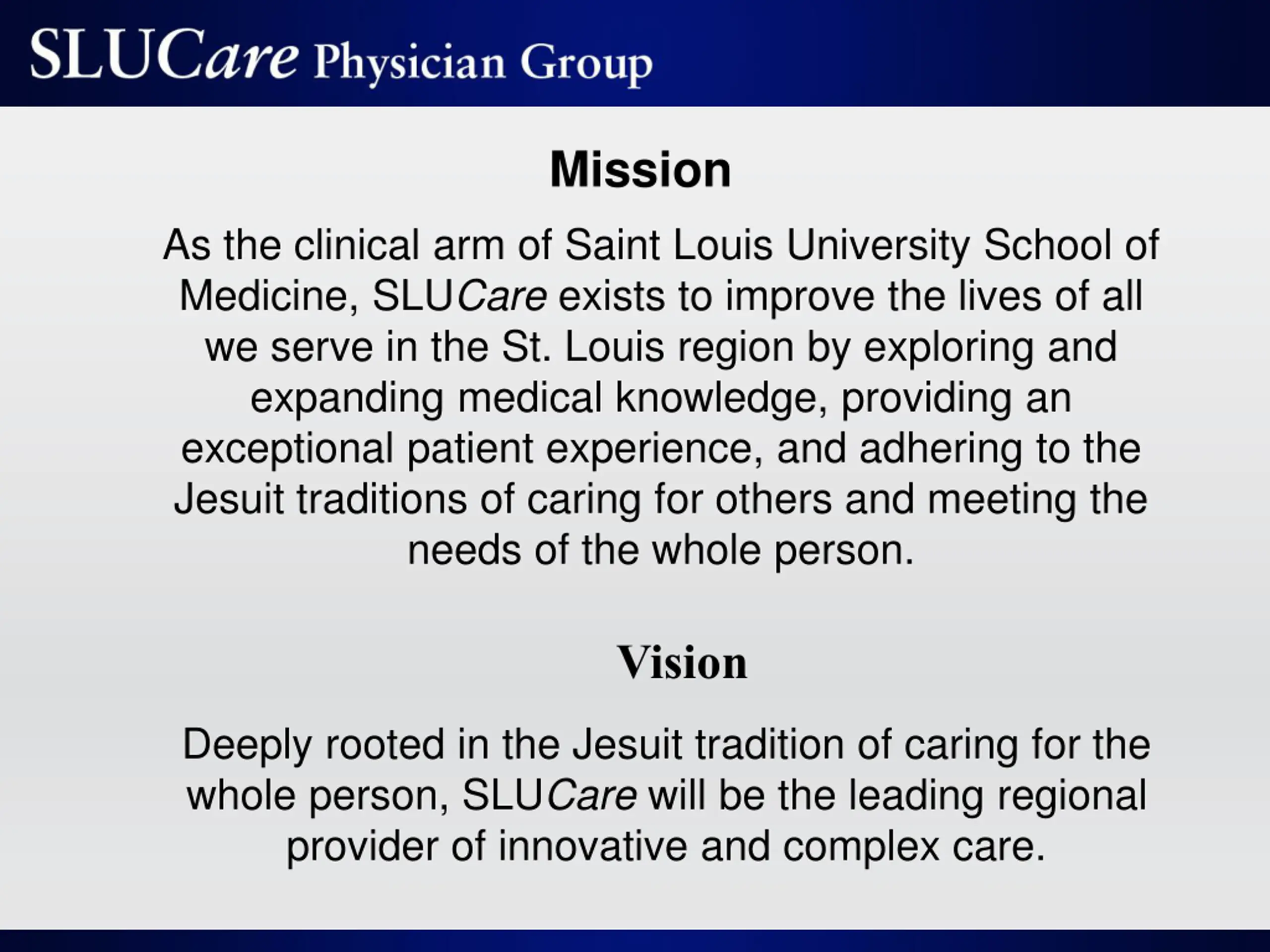Mission As the clinical arm of Saint Louis University School of Medicine, SLUCare exists to improve the lives of all we serve in the St. Louis region by exploring and expanding medical knowledge, providing an exceptional patient experience, and adhering to the Jesuit traditions of caring for others and meeting the needs of the whole person. Vision Deeply rooted in the Jesuit tradition of caring for the whole person, SLUCare will be the leading regional provider of innovative and complex care.