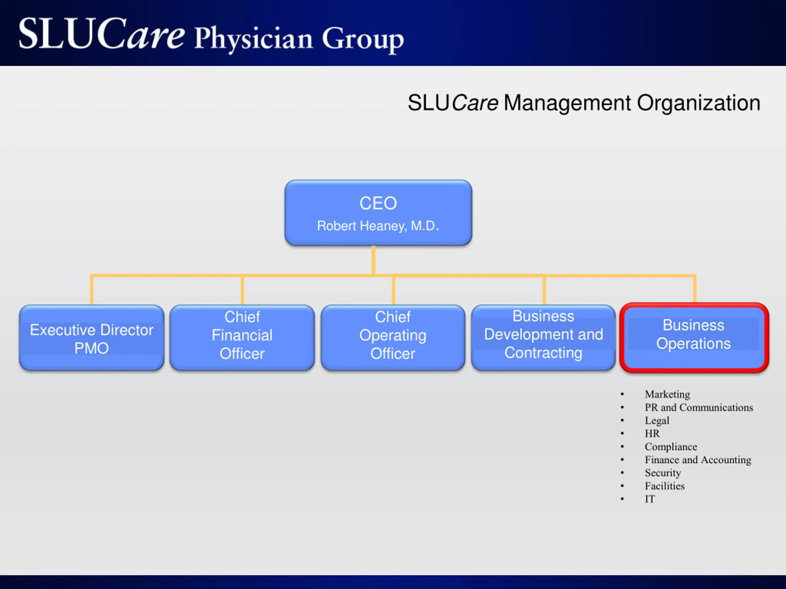 SLUCare Management Organization CEO Robert Heaney, M.D. Business Development and Contracting Chief Financial Officer Chief Operating Officer Business Operations Executive Director PMO Marketing PR and Communications Legal HR Compliance Finance and Accounting Security Facilities IT