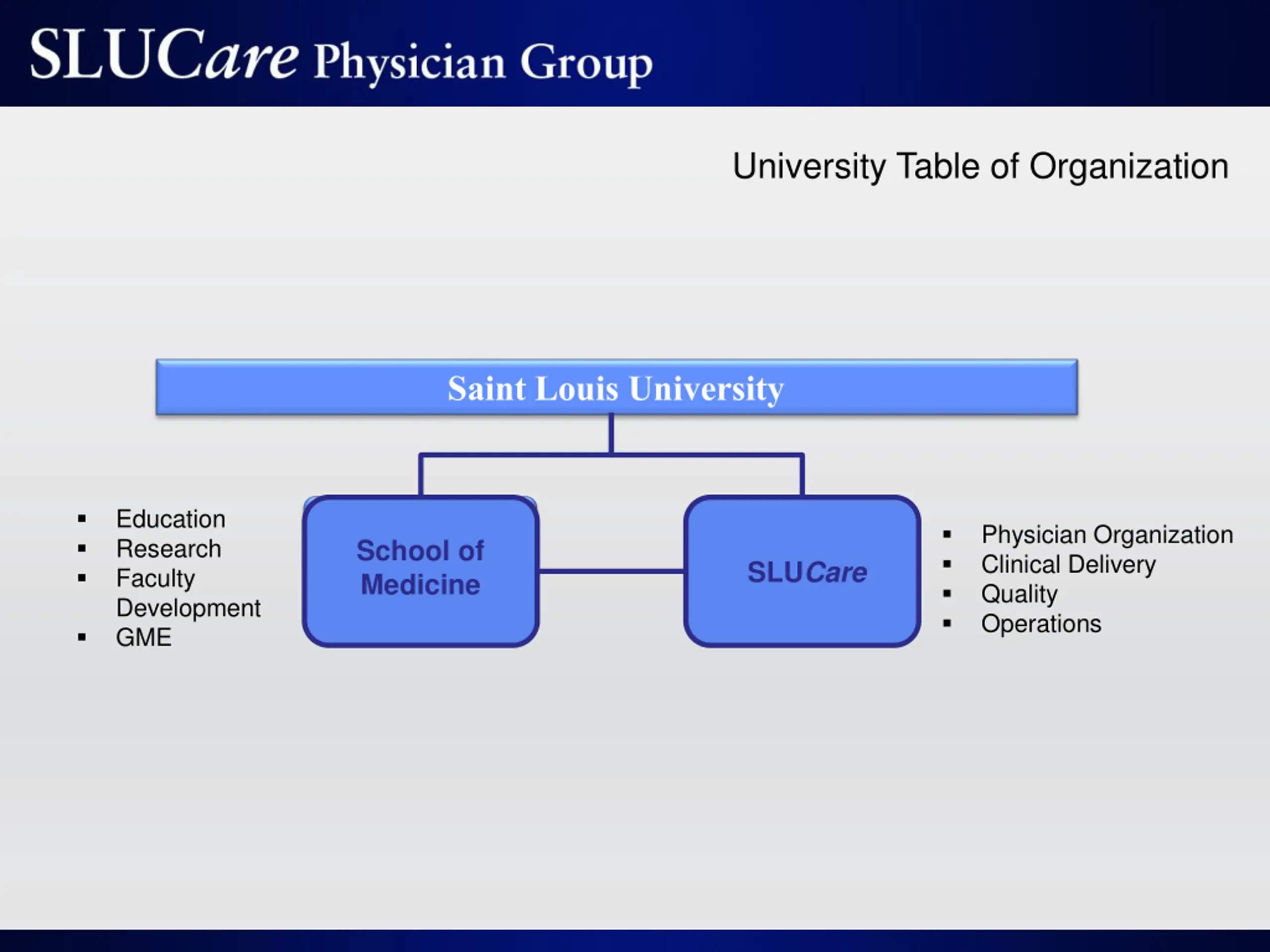 University Table of Organization Saint Louis University Education Research Faculty Development GME Physician Organization Clinical Delivery Quality Operations School of Medicine SLUCare
