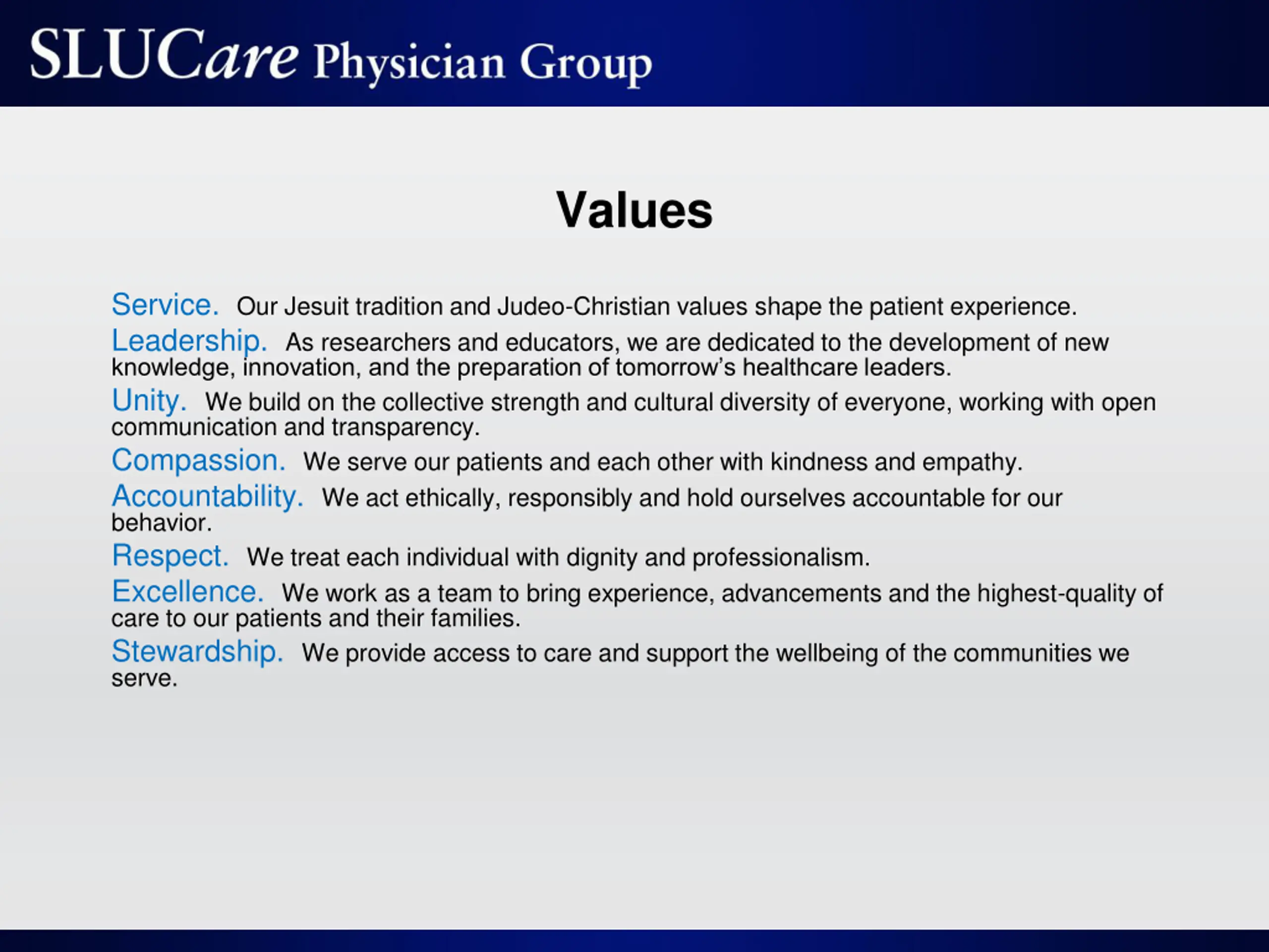 Values Service. Our Jesuit tradition and Judeo-Christian values shape the patient experience. Leadership. As researchers and educators, we are dedicated to the development of new knowledge, innovation, and the preparation of tomorrow s healthcare leaders. Unity. We build on the collective strength and cultural diversity of everyone, working with open communication and transparency. Compassion. We serve our patients and each other with kindness and empathy. Accountability. We act ethically, responsibly and hold ourselves accountable for our behavior. Respect. We treat each individual with dignity and professionalism. Excellence. We work as a team to bring experience, advancements and the highest-quality of care to our patients and their families. Stewardship. We provide access to care and support the wellbeing of the communities we serve.