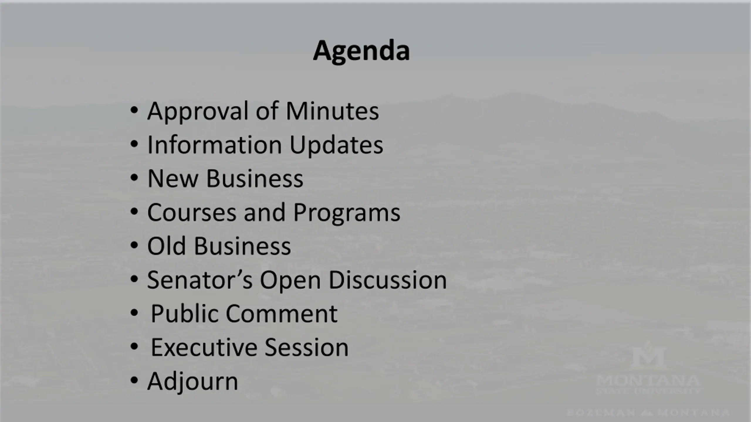 Agenda Approval of Minutes Information Updates New Business Courses and Programs Old Business Senator s Open Discussion Public Comment Executive Session Adjourn