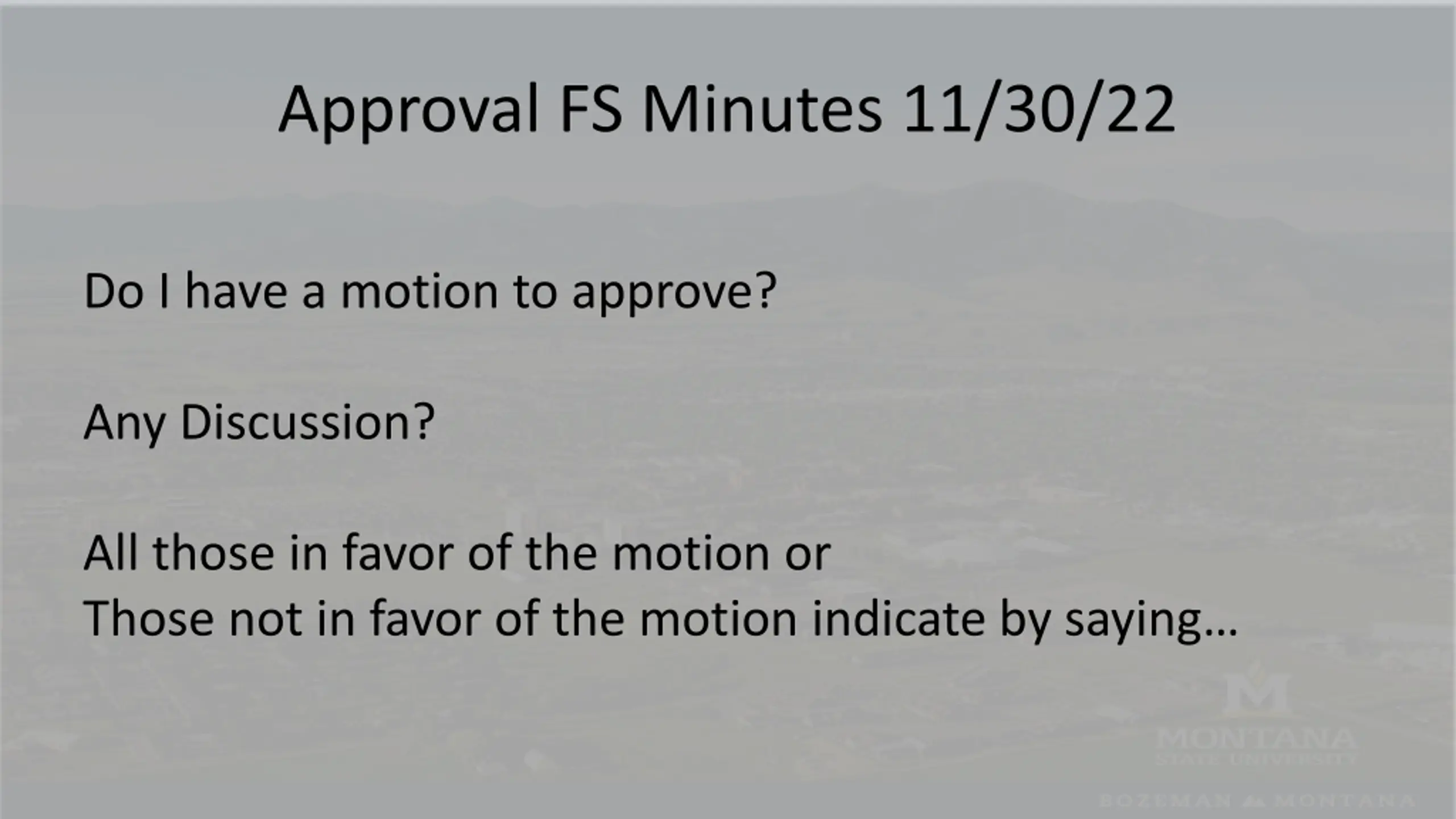 Approval FS Minutes 11/30/22 Do I have a motion to approve? Any Discussion? All those in favor of the motion or Those not in favor of the motion indicate by saying