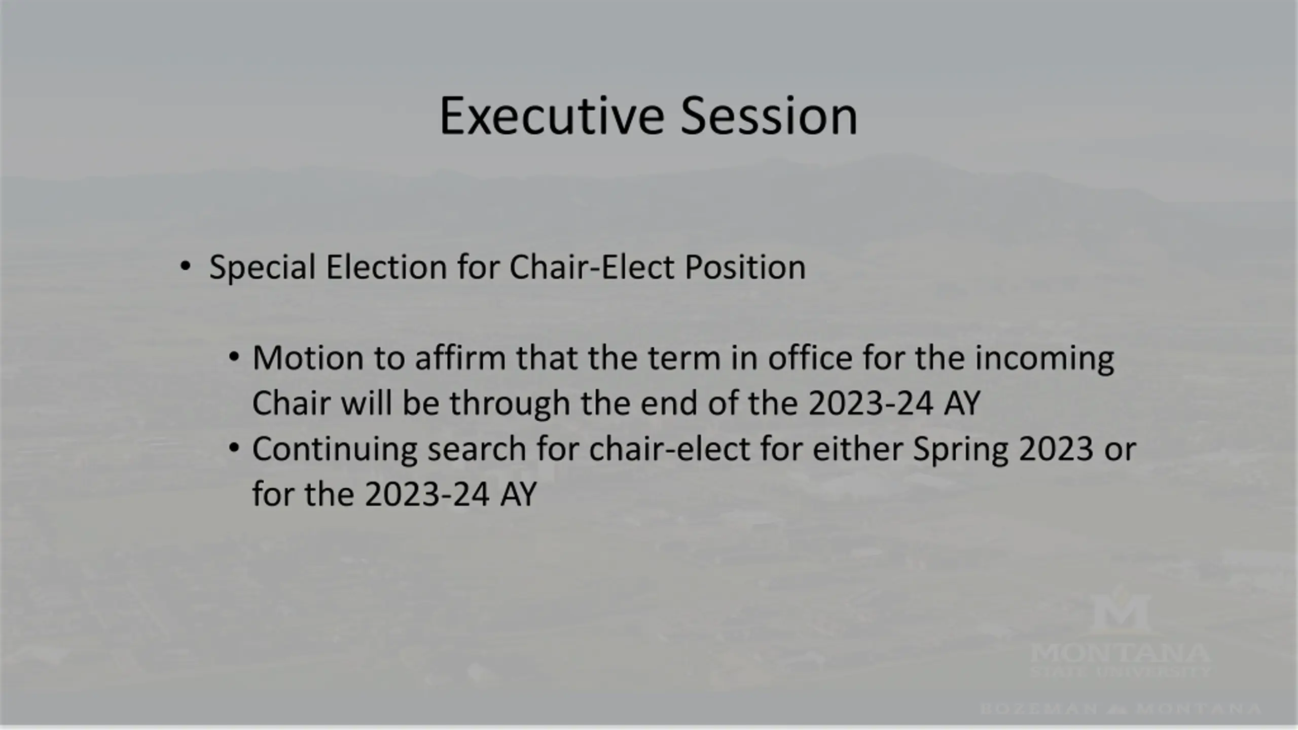 Executive Session Special Election for Chair-Elect Position Motion to affirm that the term in office for the incoming Chair will be through the end of the 2023-24 AY Continuing search for chair-elect for either Spring 2023 or for the 2023-24 AY